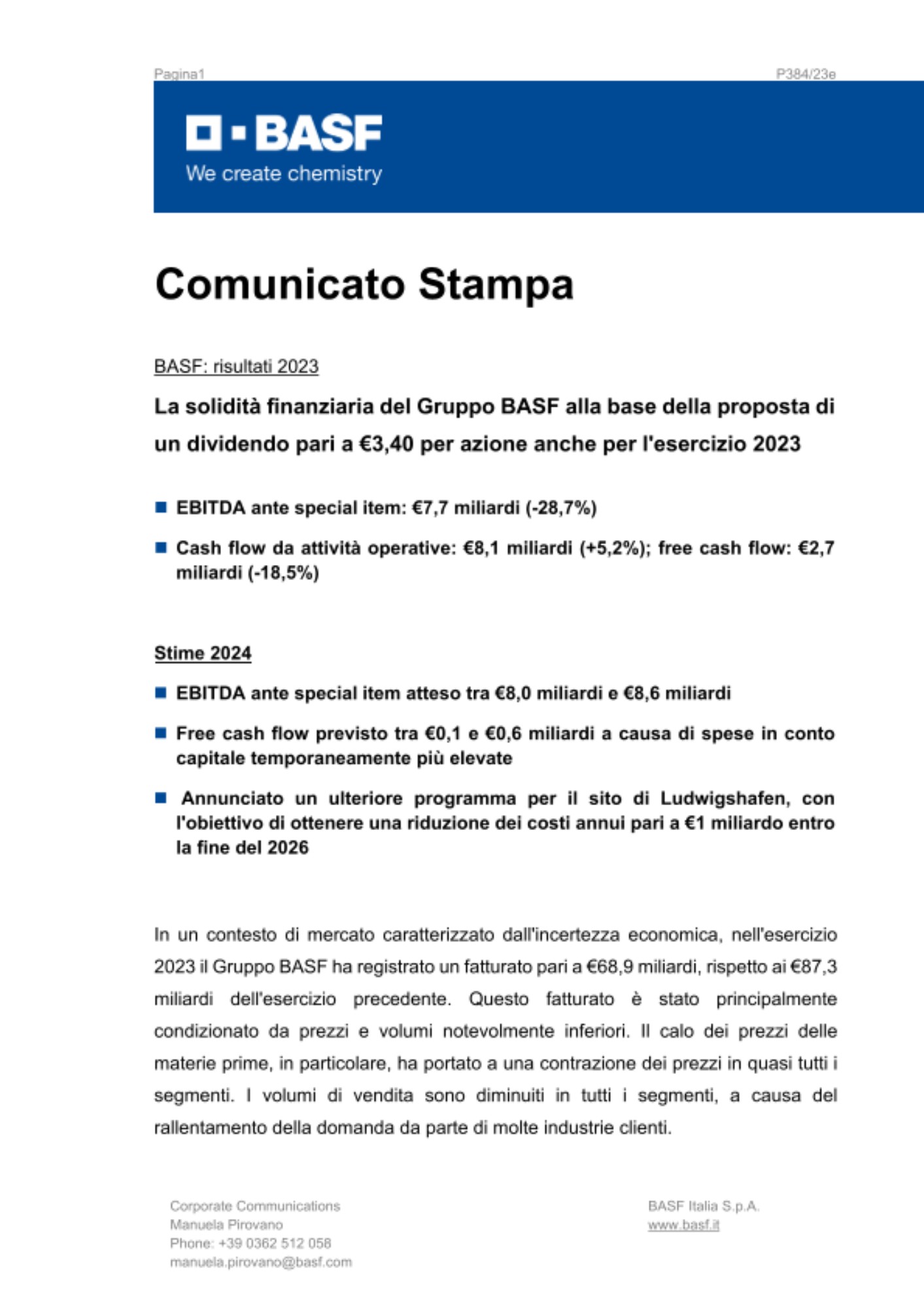 - La solidità finanziaria del Gruppo BASF alla base della proposta di un dividendo pari a €3,40 per azione anche per l'esercizio 2023