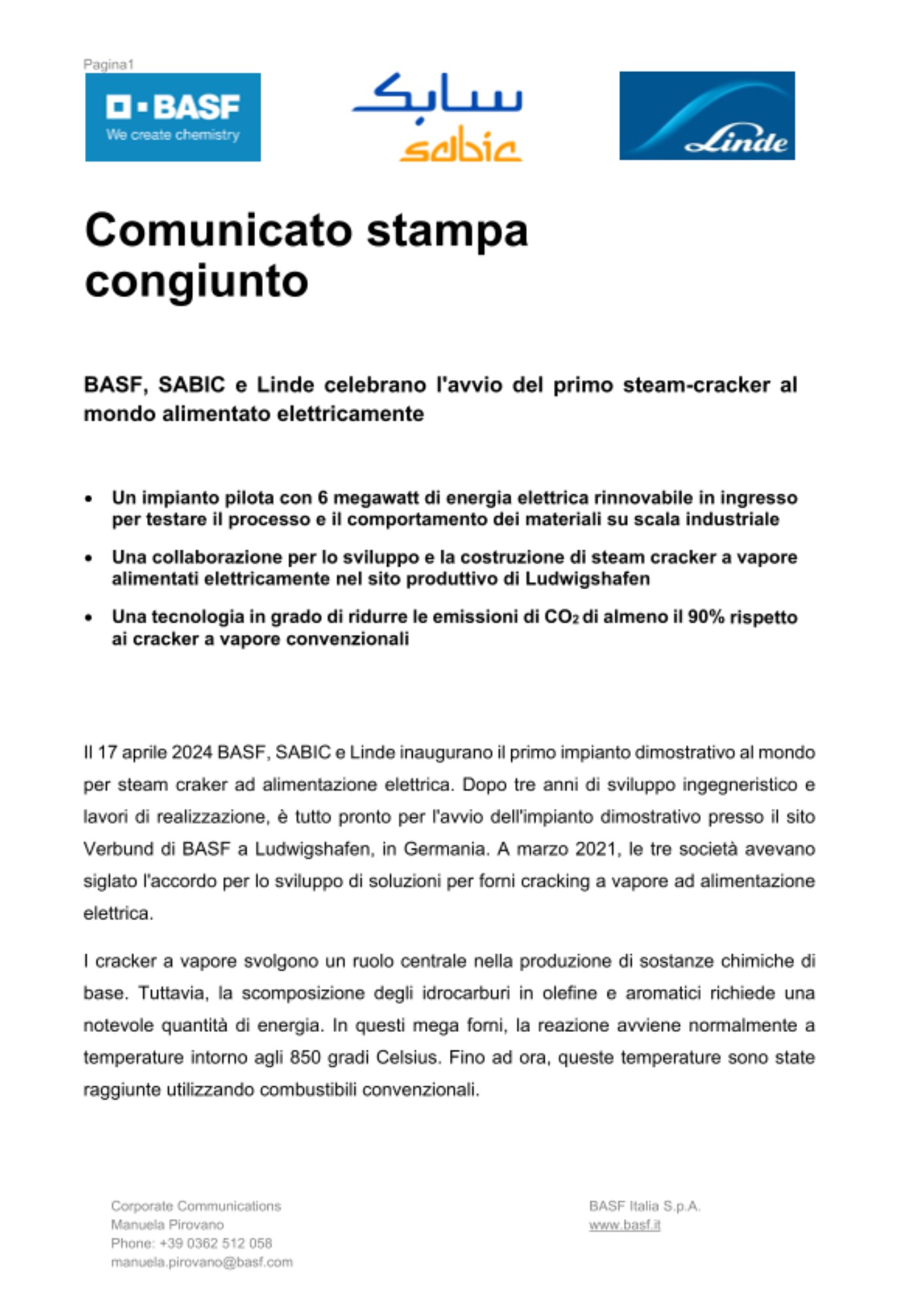 "Con lo sviluppo di steam cracker a vapore alimentati elettricamente, stiamo iniziando a lavorare ad una tecnologia fondamentale che contribuirà a ridurre significativamente le emissioni di gas serra prodotte dall'industria chimica. Sono orgoglioso di questo risultato reso possibile dalla collaborazione con i nostri partner SABIC e Linde. L'impianto dimostrativo di Ludwigshafen costituirà una preziosa esperienza e ci indicherà cosa fare per portare la tecnologia su scala industriale" ha commentato Martin Brudermüller, Presidente del Consiglio di Amministrazione di BASF SE.