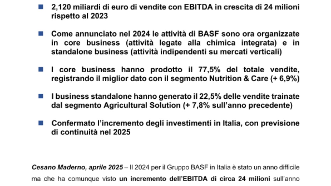 Lorenzo Bottinelli, Amministratore Delegato e Vice Presidente di BASF Italia, ha commentato: “Il 2024 è stato un anno particolare per BASF in Italia. Nonostante ci sia stata una flessione sulle vendite del 8,2% rispetto al 2023, abbiamo riscontrato una significativa tenuta dell’EBITDA che è cresciuto di 24 milioni di euro. Un risultato ottenuto perseguendo le politiche di contenimento dei costi e di attenzione ai mercati più promettenti e che riflette appieno i risultati dell’intero gruppo. L’andamento nazionale, ancora una volta, si conferma influenzato dall’andamento dell’industria europea e internazionale. Lo scenario geopolitico odierno, con la conseguente non competitività dei costi energetici, unito alla continua crisi del settore automobilistico in Europa, hanno inciso considerevolmente sulla domanda da parte dei nostri clienti. Il calo delle vendite è stato parzialmente mitigato dalla crescita in alcuni dei nostri segmenti come Agricultural Solutions e Nutrition&Care. Parte importante del successo di BASF in Italia è dovuta alle soluzioni sempre più sostenibili che proponiamo ai nostri clienti e che giocano un ruolo sempre più importante nel supporto alla trasformazione green delle singole industrie. Motivo di orgoglio per noi, resta, inoltre, il dato legato agli investimenti in Italia, che nell’anno appena conclusosi ha raggiunto il picco massimo degli ultimi 5 anni. Il sito che più ne ha beneficiato è stato quello di Pontecchio Marconi, che resta il più importante insediamento produttivo del Paese. Sempre con grande soddisfazione posso affermare che anche nel 2025 BASF prevede di continuare a investire sullo stesso sito e sugli altri presenti in Italia. Una scelta audace in questo periodo storico, ma allo stesso tempo importante, che mostra quanto l’Italia continui a essere centrale per le attività del Gruppo”.