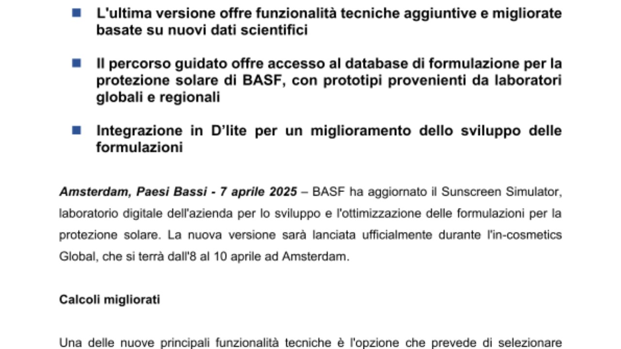 Amsterdam, Paesi Bassi - 7 aprile 2025 – BASF ha aggiornato il Sunscreen Simulator, laboratorio digitale dell'azienda per lo sviluppo e l'ottimizzazione delle formulazioni per la protezione solare. La nuova versione sarà lanciata ufficialmente durante l'in-cosmetics Global, che si terrà dall'8 al 10 aprile ad Amsterdam.
