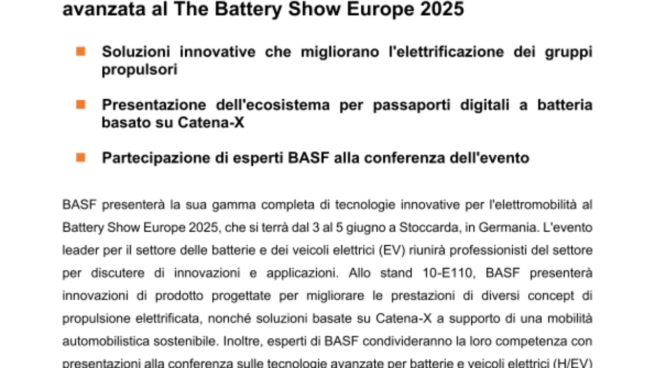 BASF presenterà la sua gamma completa di tecnologie innovative per l'elettromobilità al Battery Show Europe 2025, che si terrà dal 3 al 5 giugno a Stoccarda, in Germania. L'evento leader per il settore delle batterie e dei veicoli elettrici (EV) riunirà professionisti del settore per discutere di innovazioni e applicazioni. Allo stand 10-E110, BASF presenterà innovazioni di prodotto progettate per migliorare le prestazioni di diversi concept di propulsione elettrificata, nonché soluzioni basate su Catena-X a supporto di una mobilità automobilistica sostenibile. Inoltre, esperti di BASF condivideranno la loro competenza con presentazioni alla conferenza sulle tecnologie avanzate per batterie e veicoli elettrici (H/EV) dell'evento, a cui parteciperanno pionieri provenienti da tutto il settore.