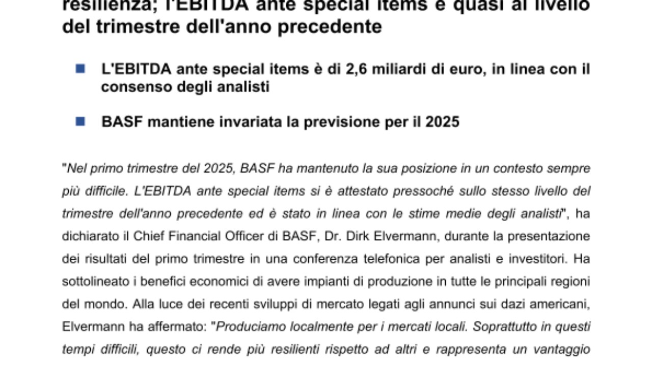 "Nel primo trimestre del 2025, BASF ha mantenuto la sua posizione in un contesto sempre più difficile. L'EBITDA prima degli elementi straordinari si è attestato pressoché sullo stesso livello del trimestre dell'anno precedente ed è stato in linea con le stime medie degli analisti", ha dichiarato il Chief Financial Officer di BASF, Dr. Dirk Elvermann, durante la presentazione dei risultati del primo trimestre in una conferenza telefonica per analisti e investitori. Ha sottolineato i benefici economici di avere impianti di produzione in tutte le principali regioni del mondo. Alla luce dei recenti sviluppi di mercato legati agli annunci sui dazi americani, Elvermann ha affermato: "Produciamo localmente per i mercati locali. Soprattutto in questi tempi difficili, questo ci rende più resilienti rispetto ad altri e rappresenta un vantaggio competitivo".