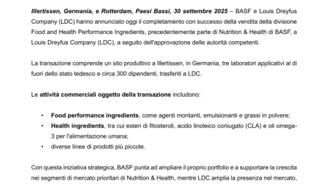 Illertissen, Germania, e Rotterdam, Paesi Bassi, 30 settembre 2025 – BASF e Louis Dreyfus Company (LDC) hanno annunciato oggi il completamento con successo della vendita della divisione Food and Health Performance Ingredients, precedentemente parte di Nutrition & Health di BASF, a Louis Dreyfus Company (LDC), a seguito dell'approvazione delle autorità competenti.