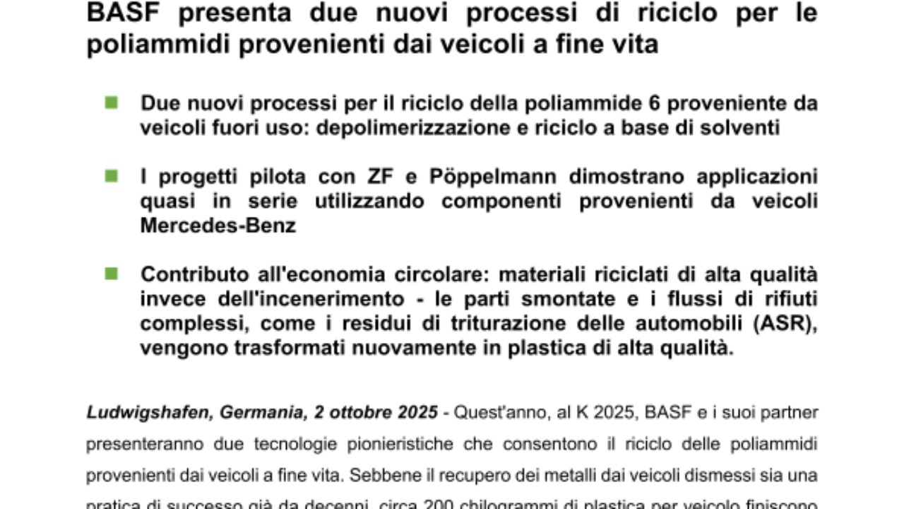 Ludwigshafen, Germania, 2 ottobre 2025 - Quest'anno, al K 2025, BASF e i suoi partner presenteranno due tecnologie pionieristiche che consentono il riciclo delle poliammidi provenienti dai veicoli a fine vita. Sebbene il recupero dei metalli dai veicoli dismessi sia una pratica di successo già da decenni, circa 200 chilogrammi di plastica per veicolo finiscono spesso negli inceneritori. Le nuove tecnologie di BASF mirano a cambiare questa situazione, soprattutto in vista dei prossimi requisiti normativi dell’End-of-Life Vehicle Regulation (ELVR). I progetti pilota dimostrano come i rifiuti automobilistici possano essere utilizzati come materiale e reinseriti in un ciclo chiuso per l'industria automobilistica.
