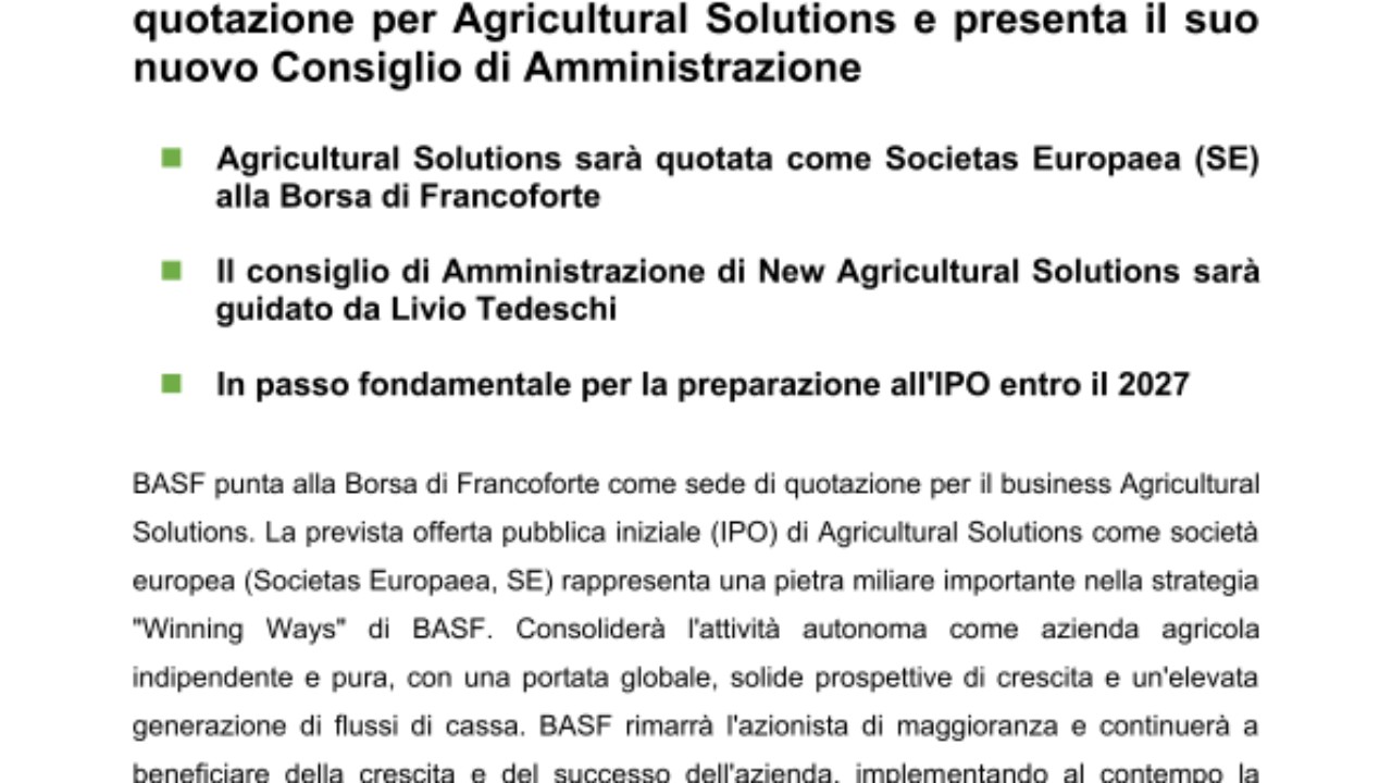 BASF punta alla Borsa di Francoforte come sede di quotazione per il business Agricultural Solutions. La prevista offerta pubblica iniziale (IPO) di Agricultural Solutions come società europea (Societas Europaea, SE) rappresenta una pietra miliare importante nella strategia "Winning Ways" di BASF. Consoliderà l'attività autonoma come azienda agricola indipendente e pura, con una portata globale, solide prospettive di crescita e un'elevata generazione di flussi di cassa. BASF rimarrà l'azionista di maggioranza e continuerà a beneficiare della crescita e del successo dell'azienda, implementando al contempo la governance aziendale consueta sul mercato.