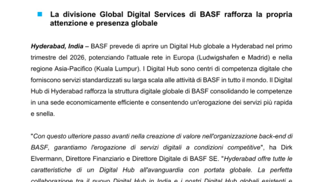 Hyderabad, India – BASF prevede di aprire un Digital Hub globale a Hyderabad nel primo trimestre del 2026, potenziando l'attuale rete in Europa (Ludwigshafen e Madrid) e nella regione Asia-Pacifico (Kuala Lumpur). I Digital Hub sono centri di competenza digitale che forniscono servizi standardizzati su larga scala alle attività di BASF in tutto il mondo. Il Digital Hub di Hyderabad rafforza la struttura digitale globale di BASF consolidando le competenze in una sede economicamente efficiente e consentendo un'erogazione dei servizi più rapida e snella.