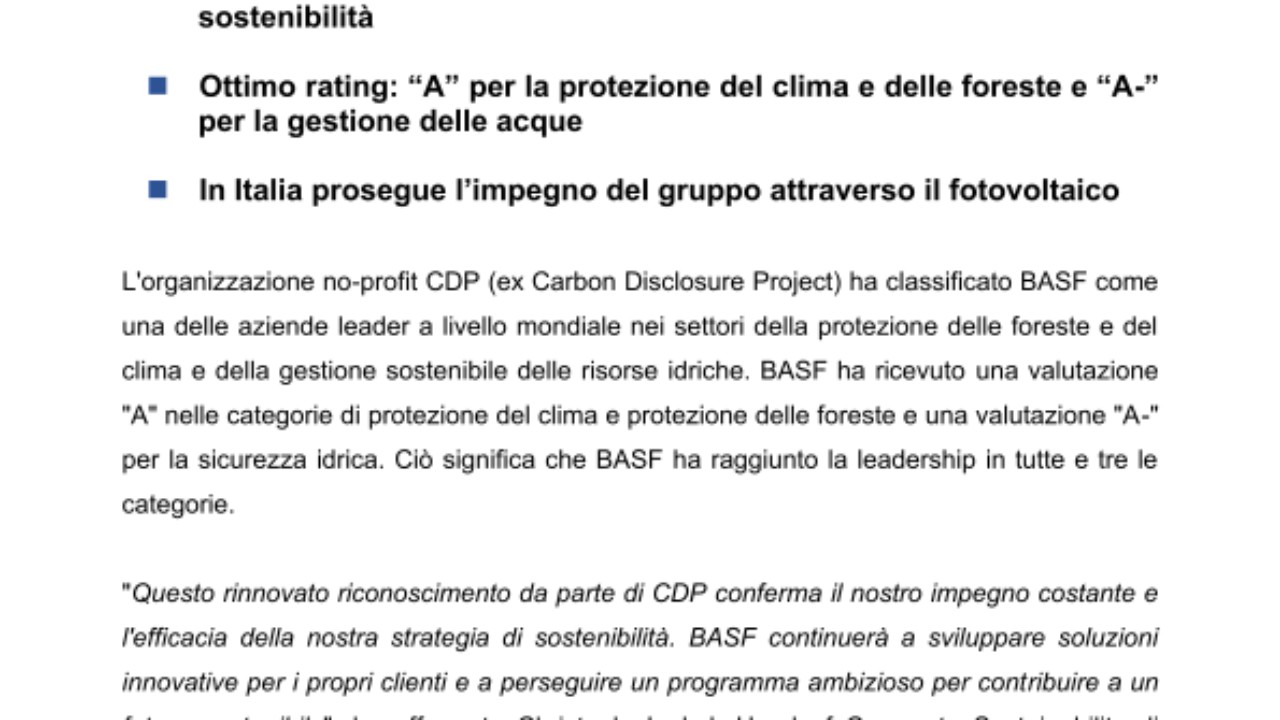 "Questo rinnovato riconoscimento da parte di CDP conferma il nostro impegno costante e l'efficacia della nostra strategia di sostenibilità. BASF continuerà a sviluppare soluzioni innovative per i propri clienti e a perseguire un programma ambizioso per contribuire a un futuro sostenibile", ha affermato Christoph Jaekel, Head of Corporate Sustainability di BASF.