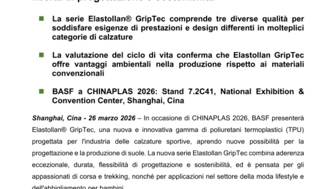 Shanghai, Cina – In occasione di CHINAPLAS 2026, BASF presenterà Elastollan® GripTec, una nuova e innovativa gamma di poliuretani termoplastici (TPU) progettata per l'industria delle calzature sportive, aprendo nuove possibilità per la progettazione e la produzione di suole. La nuova serie Elastollan GripTec combina aderenza eccezionale, durata, flessibilità di progettazione e sostenibilità, ed è pensata per gli appassionati di corsa e trekking, nonché per applicazioni nel settore della moda lifestyle e dell'abbigliamento per bambini.