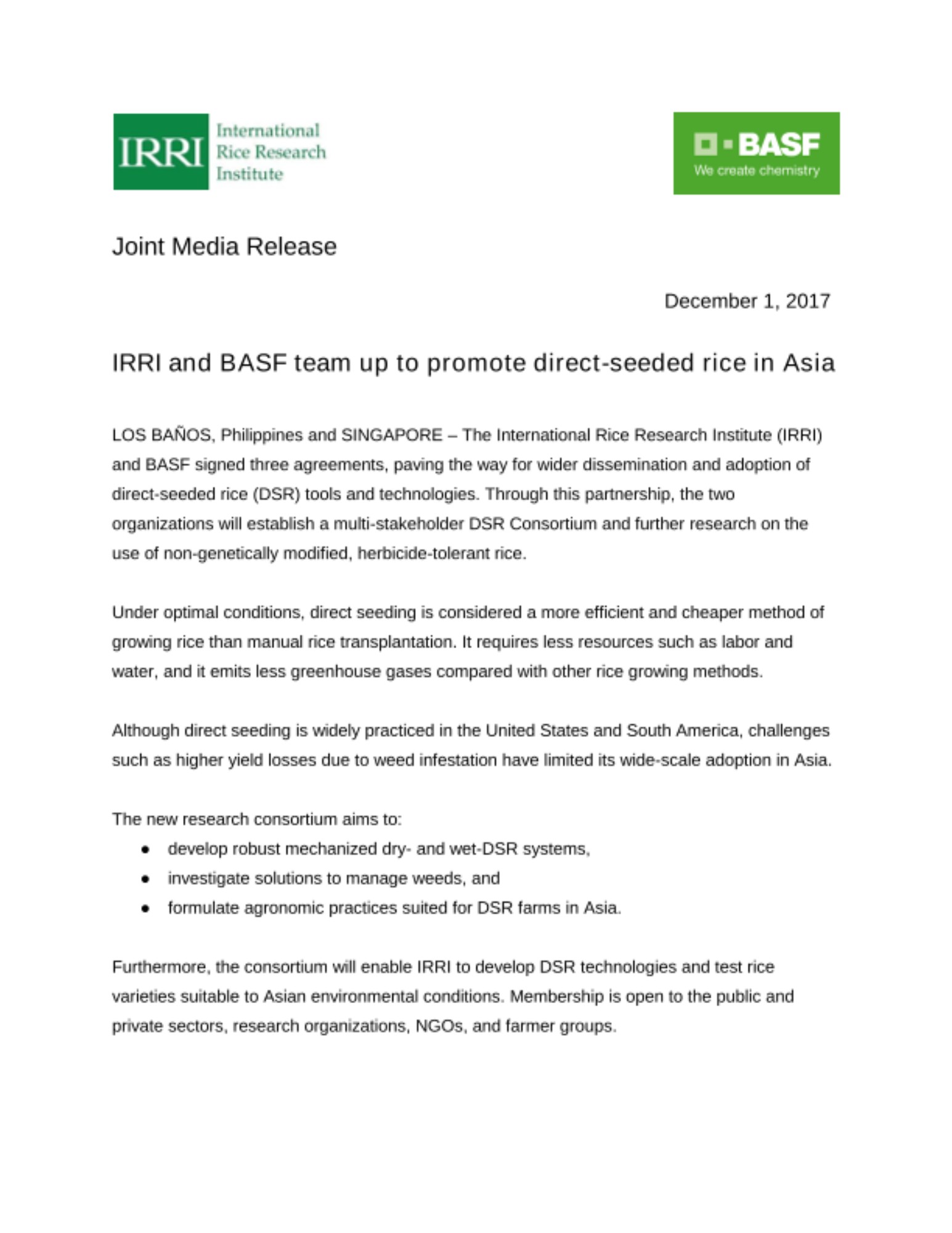 IRRI and BASF team up to promote direct-seeded rice in Asia