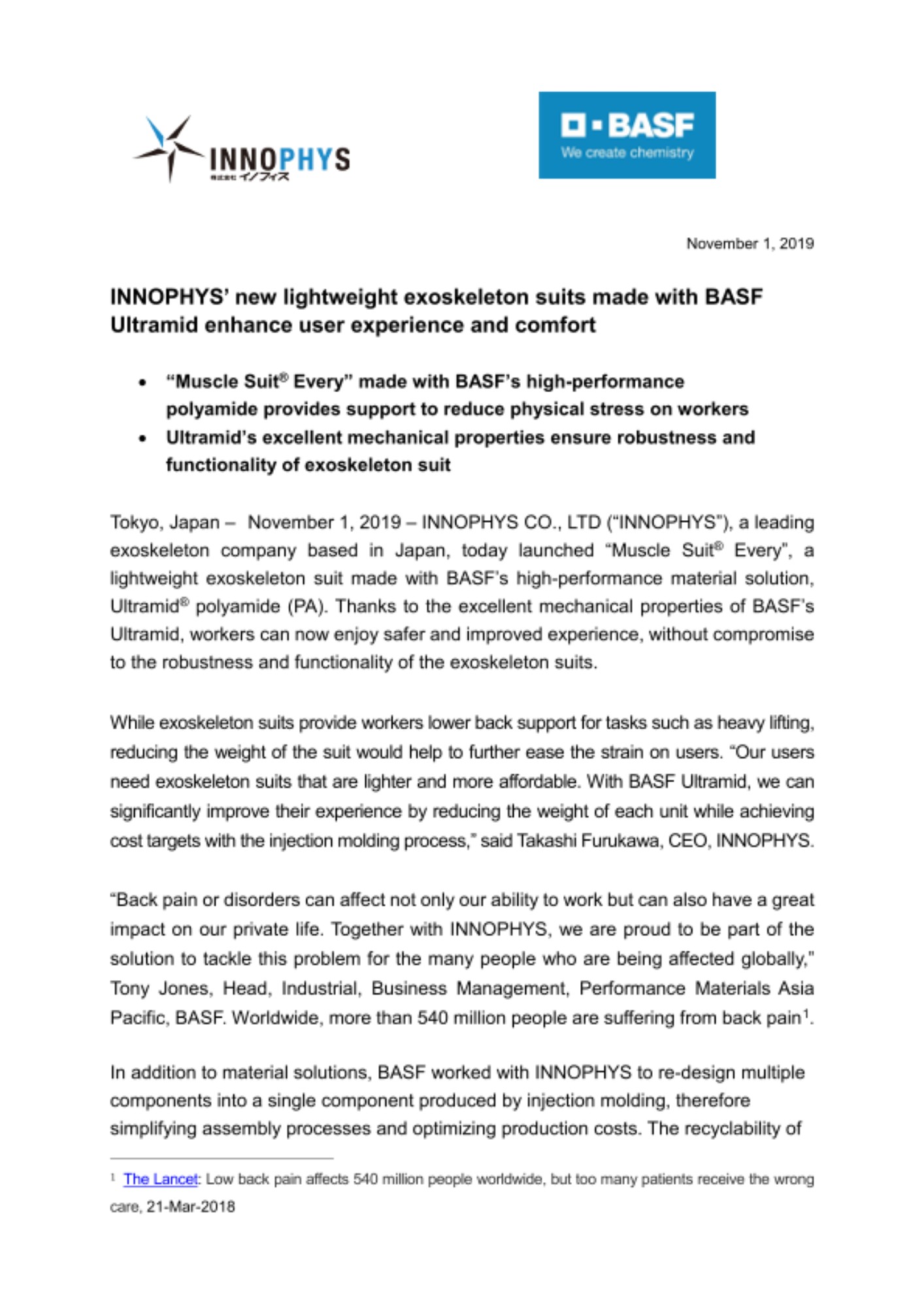 “Back pain or disorders can affect not only our ability to work but can also have a great impact on our private life. Together with INNOPHYS, we are proud to be part of the solution to tackle this problem for the many people who are being affected globally,” Tony Jones, Head, Industrial, Business Management, Performance Materials Asia Pacific, BASF. Worldwide, more than 540 million people are suffering from back pain[1].