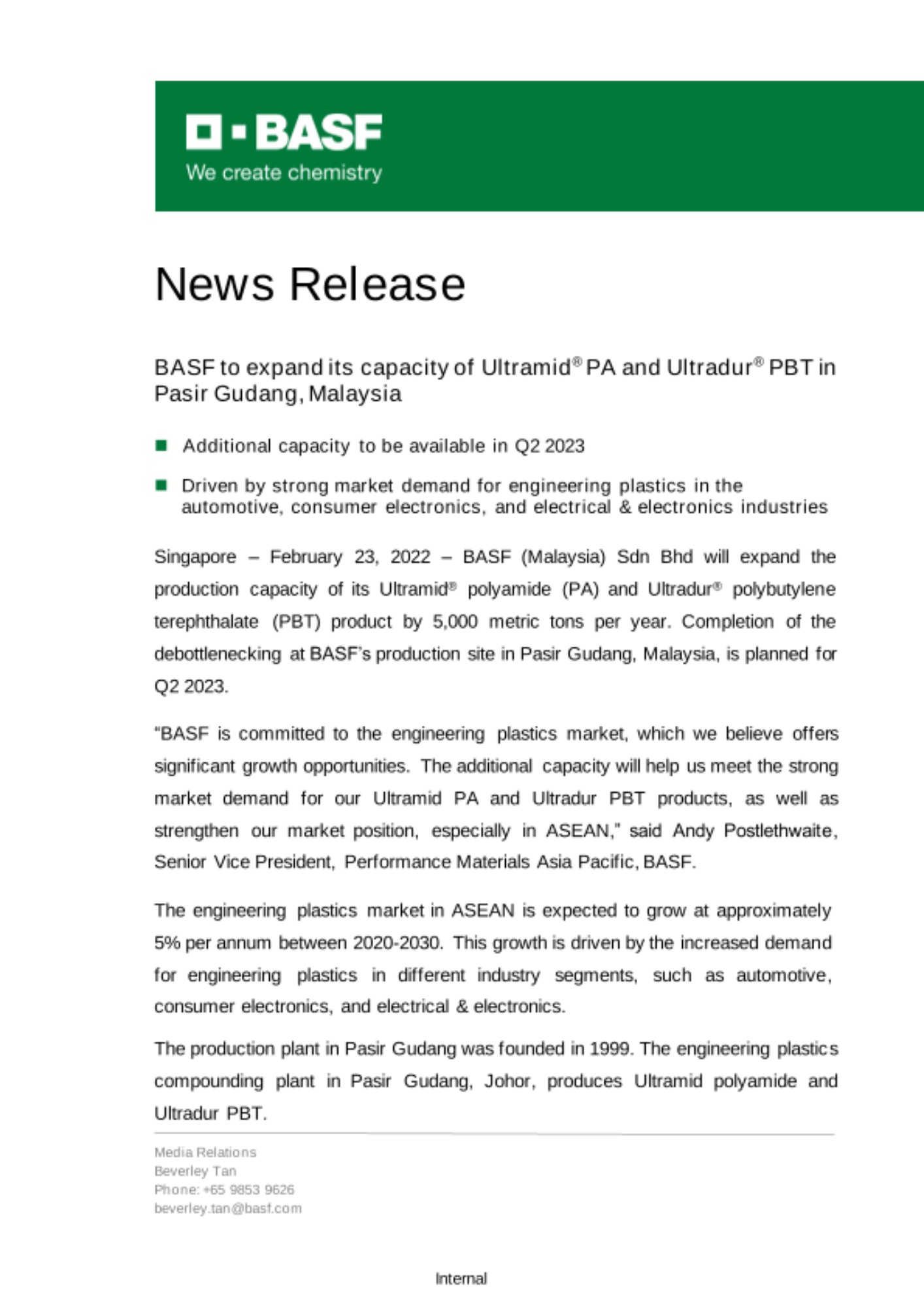 “BASF is committed to the engineering plastics market, which we believe offers significant growth opportunities. The additional capacity will help us meet the strong market demand for our Ultramid PA and Ultradur PBT products, as well as strengthen our market position, especially in ASEAN,” said Andy Postlethwaite, Senior Vice President, Performance Materials Asia Pacific, BASF.
