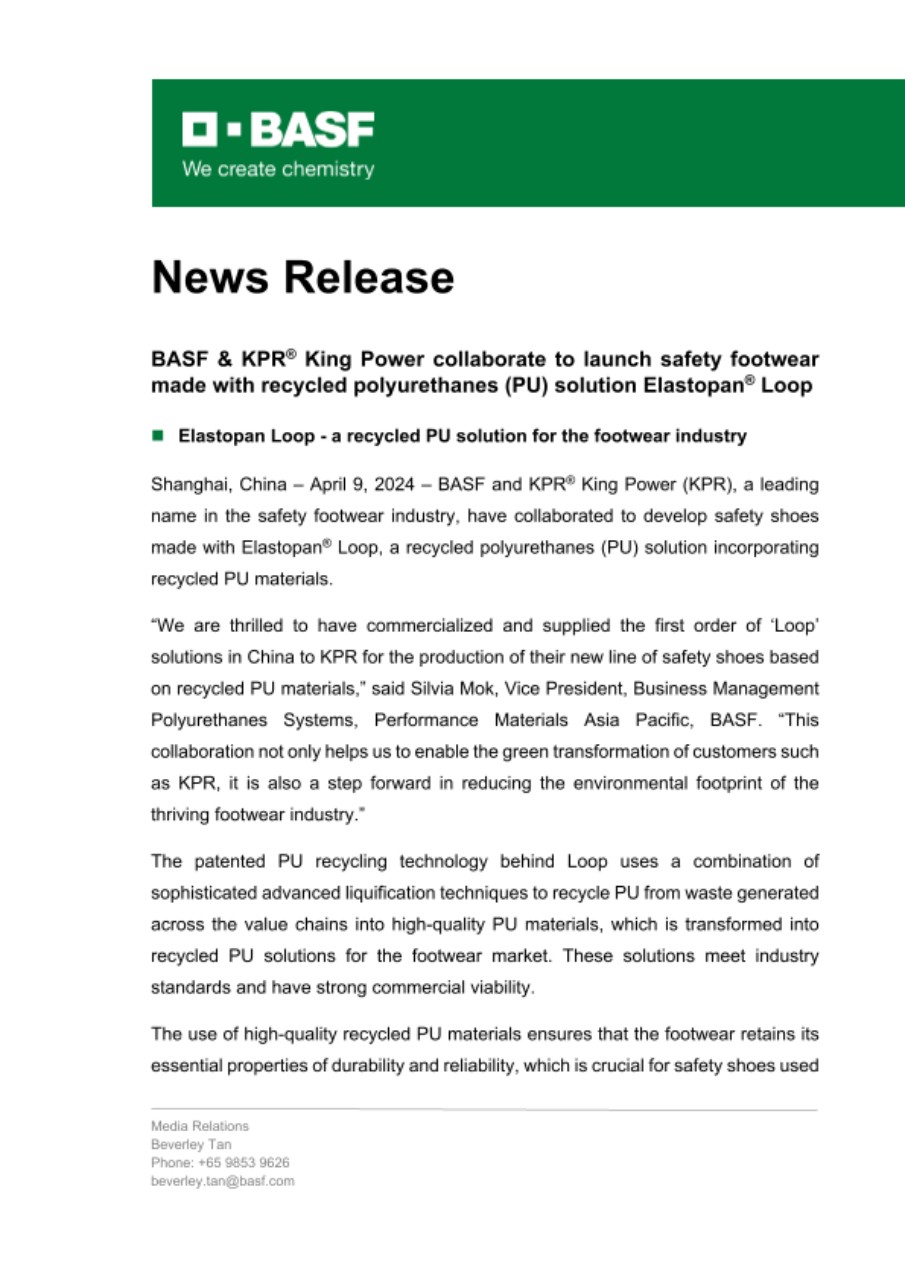 Shanghai, China – April 9, 2024 – BASF and KPR® King Power (KPR), a leading name in the safety footwear industry, have collaborated to develop safety shoes made with Elastopan® Loop, a recycled polyurethanes (PU) solution incorporating recycled PU materials.