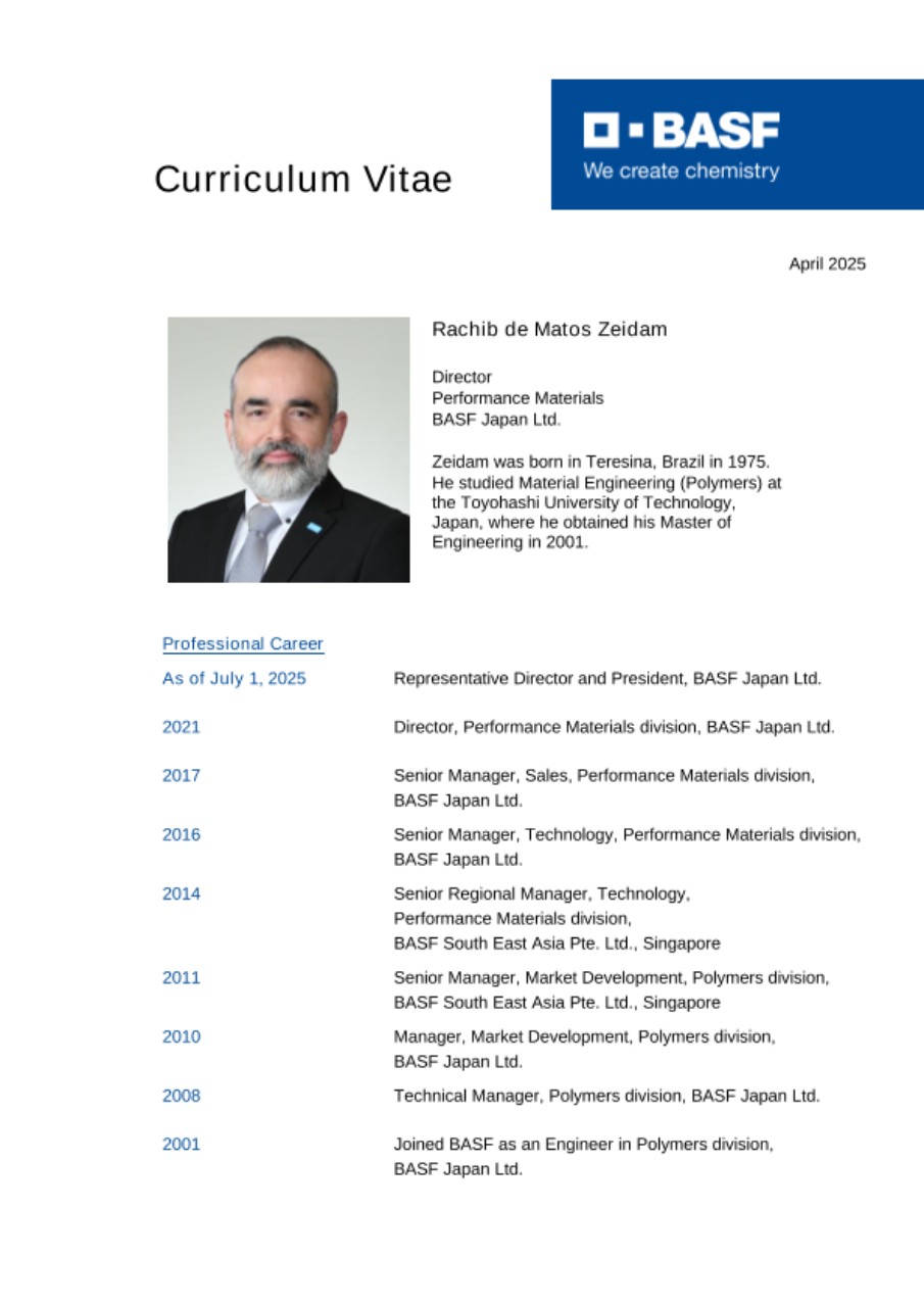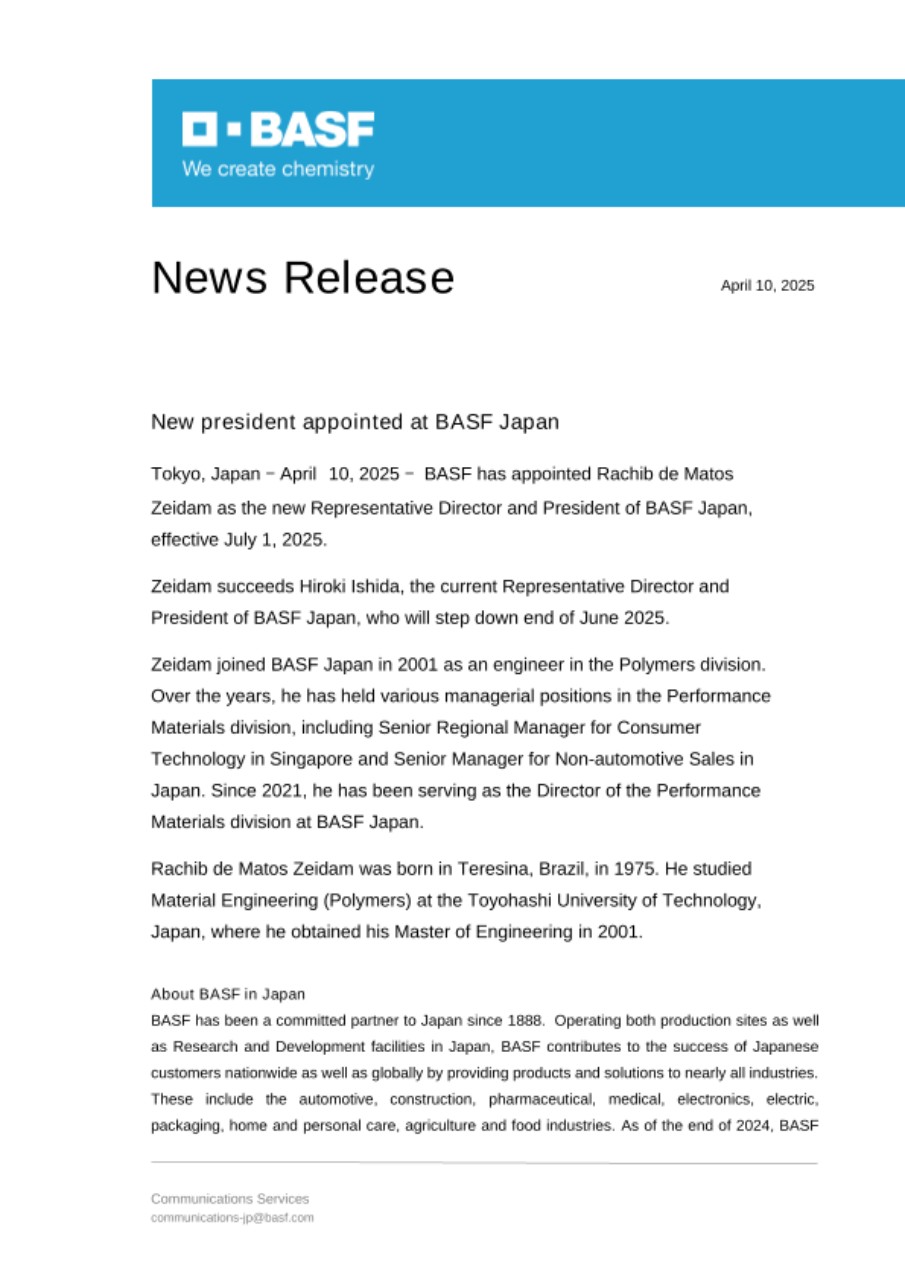 Zeidam succeeds Hiroki Ishida, the current Representative Director and President of BASF Japan, who will step down end of June 2025.
