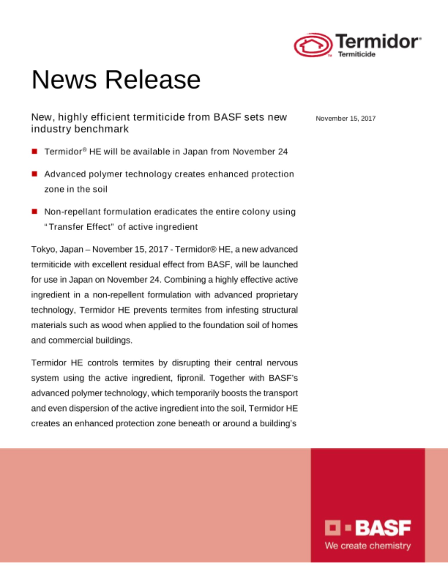 Tokyo, Japan – November 15, 2017 - Termidor® HE, a new advanced termiticide with excellent residual effect from BASF, will be launched for use in Japan on November 24. Combining a highly effective active ingredient in a non-repellent formulation with advanced proprietary technology, Termidor HE prevents termites from infesting structural materials such as wood when applied to the foundation soil of homes and commercial buildings.