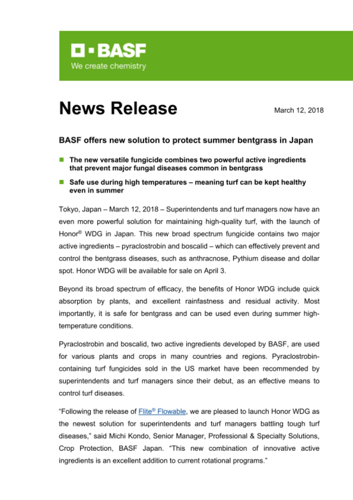 Tokyo, Japan – March 12, 2018 – Superintendents and turf managers now have an even more powerful solution for maintaining high-quality turf, with the launch of Honor® WDG in Japan. This new broad spectrum fungicide contains two major active ingredients – pyraclostrobin and boscalid – which can effectively prevent and control the bentgrass diseases, such as anthracnose, Pythium disease and dollar spot. Honor WDG will be available for sale on April 3.