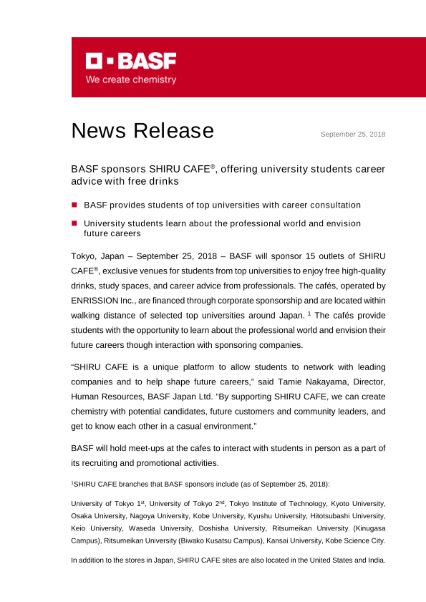 Tokyo, Japan – September 25, 2018 – BASF will sponsor 15 outlets of SHIRU CAFE®, exclusive venues for students from top universities to enjoy free high-quality drinks, study spaces, and career advice from professionals. The cafés, operated by ENRISSION Inc., are financed through corporate sponsorship and are located within walking distance of selected top universities around Japan. 1 The cafés provide students with the opportunity to learn about the professional world and envision their future careers though interaction with sponsoring companies.