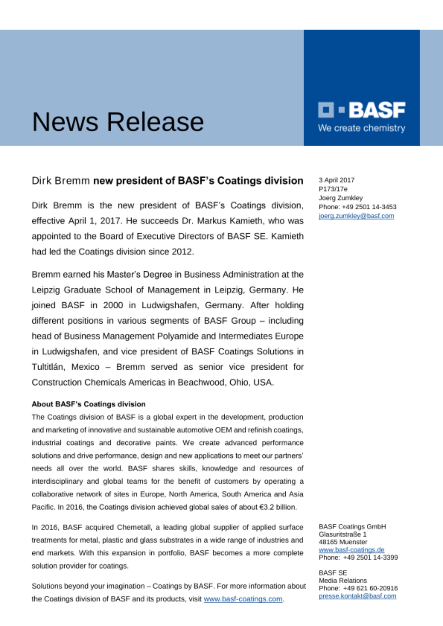 Dirk Bremm is the new president of BASF’s Coatings division, effective April 1, 2017. He succeeds Dr. Markus Kamieth, who was appointed to the Board of Executive Directors of BASF SE. Kamieth had led the Coatings division since 2012.