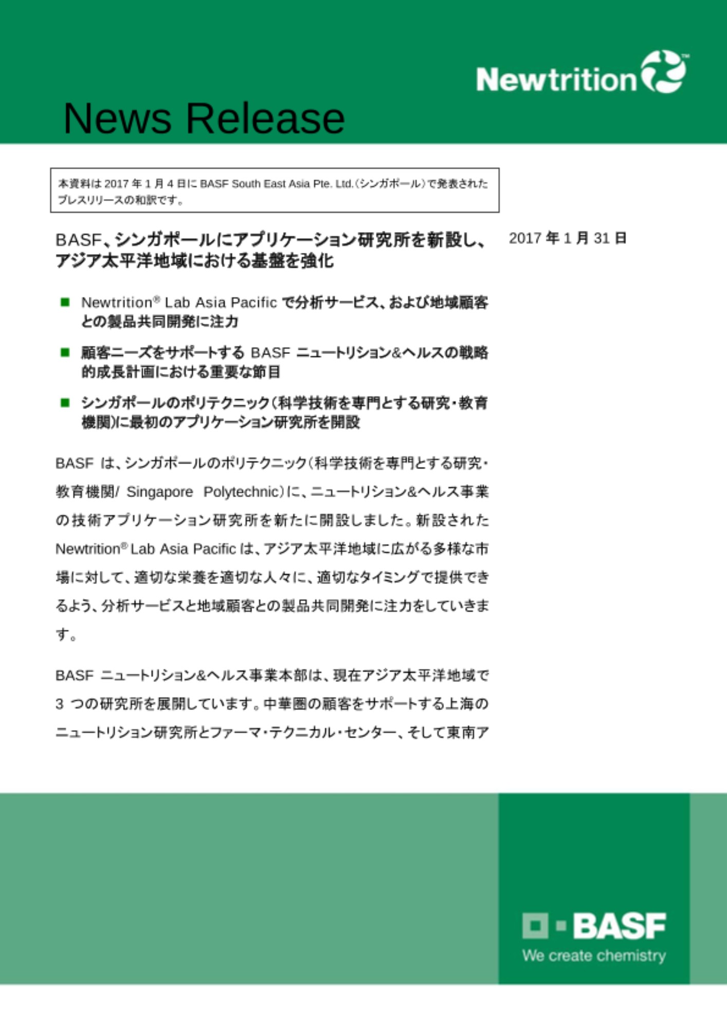 BASFは、シンガポールのポリテクニック(科学技術を専門とする研究・教育機関/ Singapore Polytechnic)に、ニュートリション&ヘルス事業の技術アプリケーション研究所を新たに開設しました。新設されたNewtrition® Lab Asia Pacificは、アジア太平洋地域に広がる多様な市場に対して、適切な栄養を適切な人々に、適切なタイミングで提供できるよう、分析サービスと地域顧客との製品共同開発に注力をしていきます。
