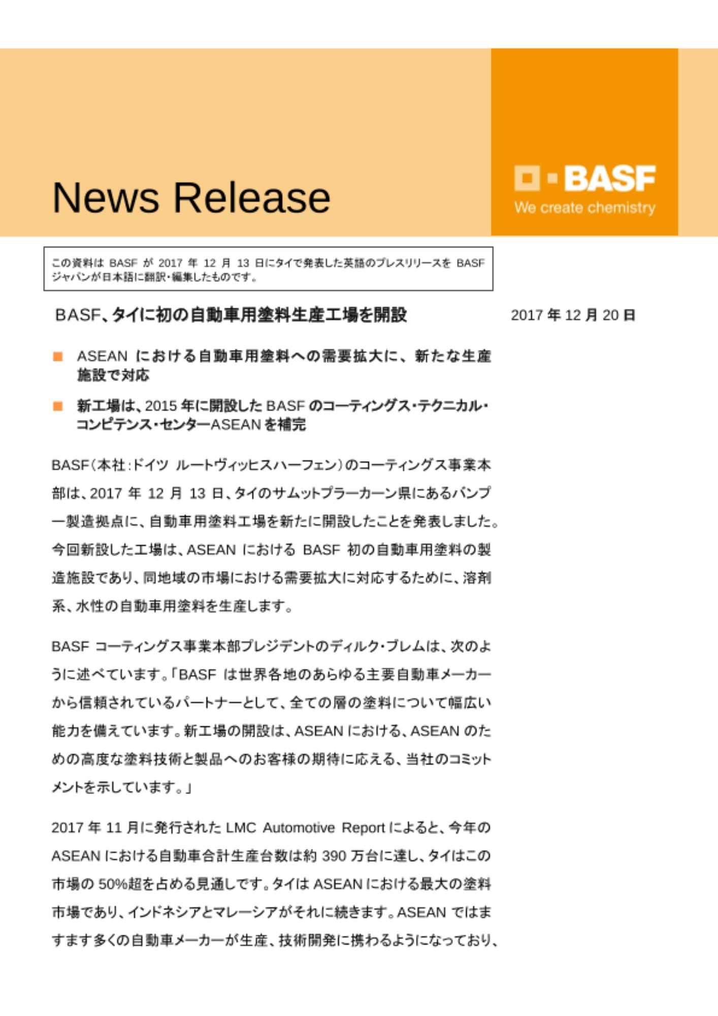 - 新工場は、2015年に開設したBASFのコーティングス・テクニカル・コンピテンス・センターASEANを補完