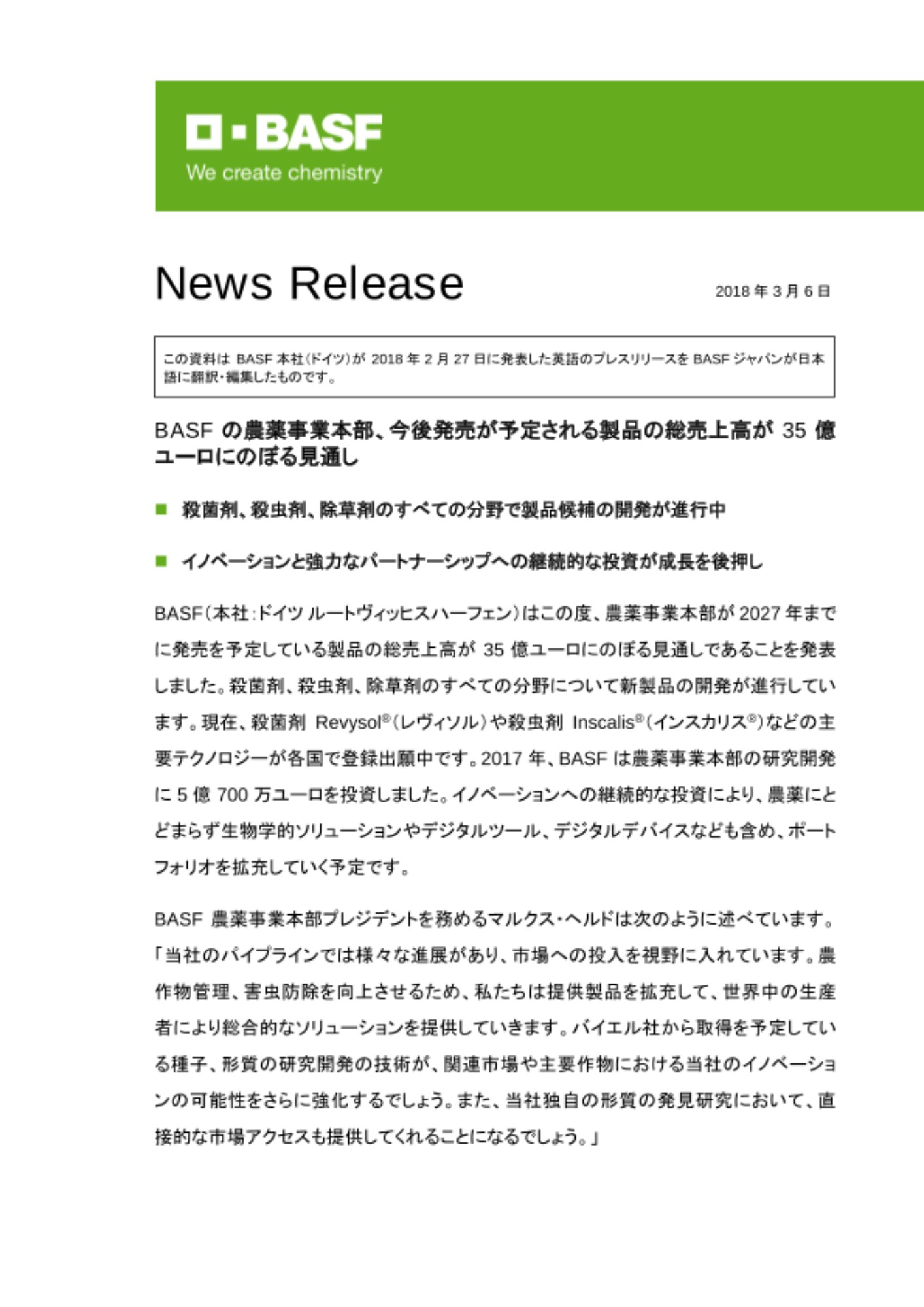 (この資料は BASF本社(ドイツ)が 2018年2月27日に発表した英語のプレスリリースをBASFジャパンが日本語に翻訳・編集したものです。)