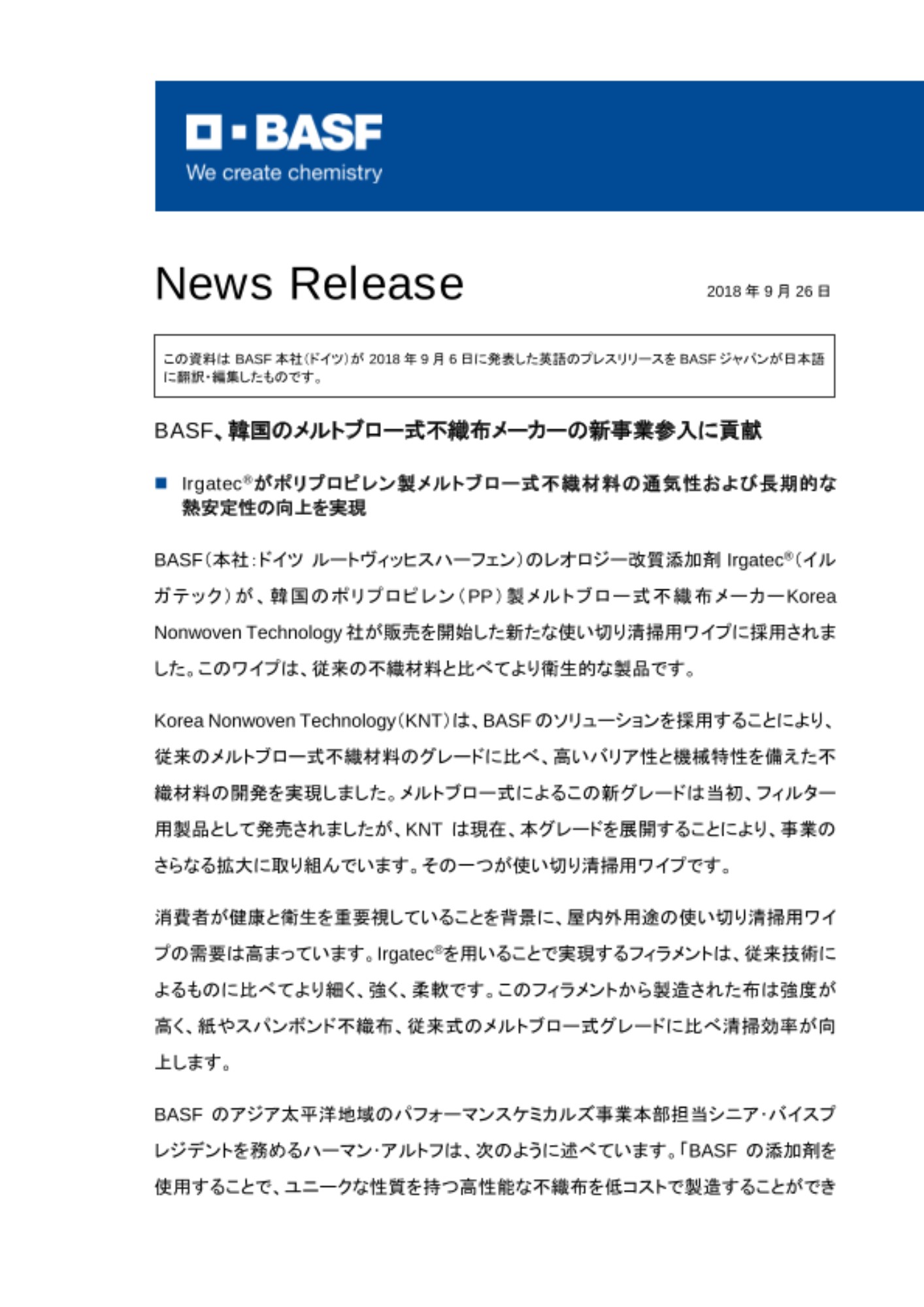 BASF(本社:ドイツ ルートヴィッヒスハーフェン)のレオロジー改質添加剤Irgatec®(イルガテック)が、韓国のポリプロピレン(PP)製メルトブロー式不織布メーカーKorea Nonwoven Technology社が販売を開始した新たな使い切り清掃用ワイプに採用されました。このワイプは、従来の不織材料と比べてより衛生的な製品です。