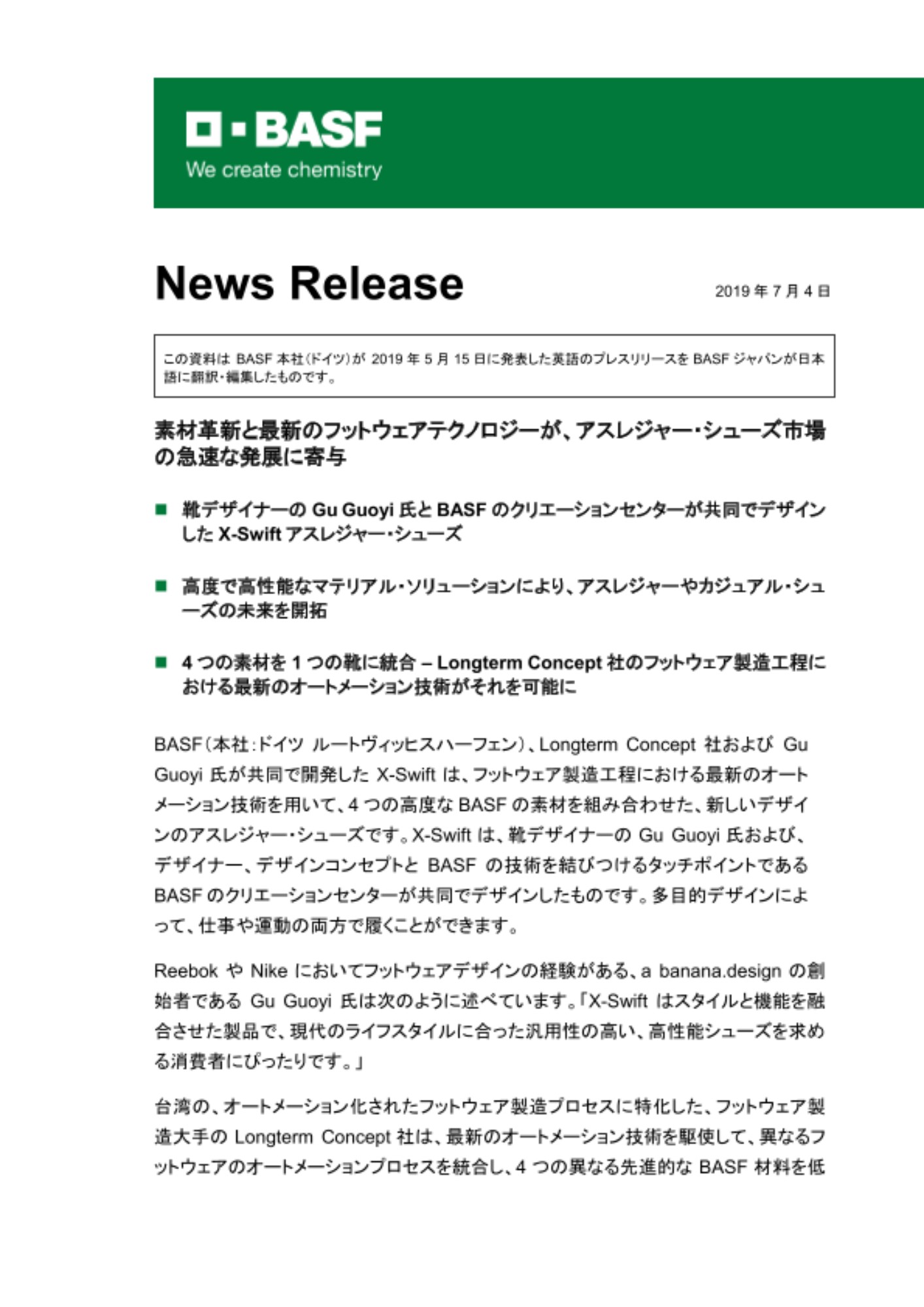 「フットウェア市場は非常に活発で速いスピード発展しています。私たちは材料の限界を探求するために日々挑戦しています。今回の協業のために、最先端のフットウェア素材の品質を組み合わせ、新製造技術の無限の可能性を持つ試作品を作り上げています」 と、BASFパフォーマンスマテリアルズ事業本部アジア太平洋地域 コンシューマーインダストリー部門 バイスプレジデントのマンフレッド・パウロウスキは述べています。「時代を超越したシンプルなスタイル、快適な履き心地、ソールのパフォーマンスを備えたX-Swiftは、スポーツを愛するすべての人の親友であり、未来のフットウェアを可能にするゲームチェンジャーです。」
