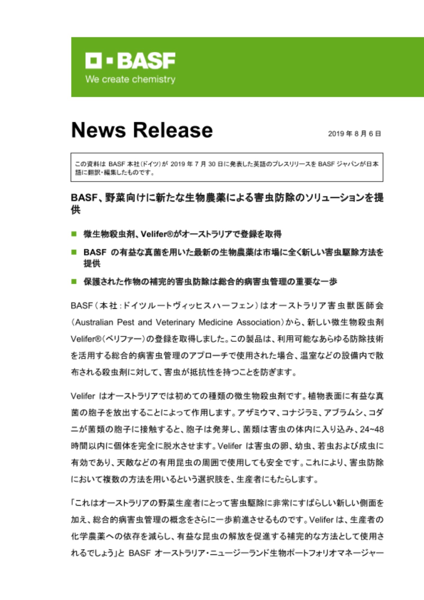 BASF(本社:ドイツルートヴィッヒスハーフェン)はオーストラリア害虫獣医師会(Australian Pest and Veterinary Medicine Association)から、新しい微生物殺虫剤 Velifer®(ベリファー)の登録を取得しました。この製品は、利用可能なあらゆる防除技術を活用する総合的病害虫管理のアプローチで使用された場合、温室などの設備内で散布される殺虫剤に対して、害虫が抵抗性を持つことを防ぎます。