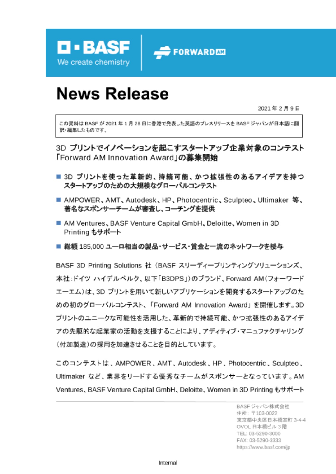 BASF 3D Printing Solutions社 (BASFスリーディープリンティングソリューションズ、本社:ドイツ ハイデルベルク、以下「B3DPS」)のブランド、Forward AM(フォーワードエーエム)は、3Dプリントを用いて新しいアプリケーションを開発するスタートアップのための初のグローバルコンテスト、 「Forward AM Innovation Award」 を開催します。3Dプリントのユニークな可能性を活用した、革新的で持続可能、かつ拡張性のあるアイデアの先駆的な起業家の活動を支援することにより、アディティブ・マニュファクチャリング(付加製造)の採用を加速させることを目的としています。