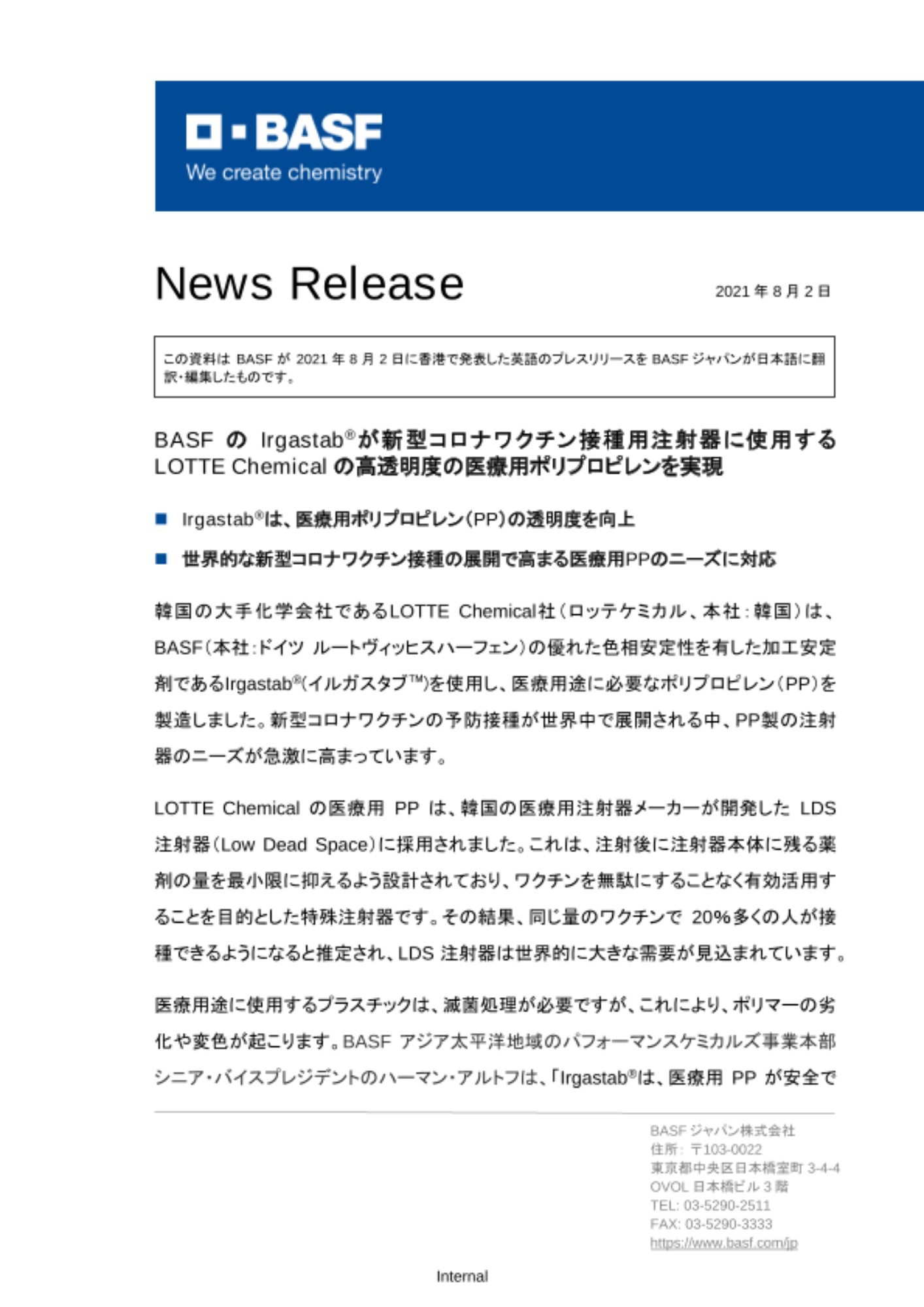 韓国の大手化学会社であるLOTTE Chemical社(ロッテケミカル、本社:韓国)は、BASF(本社:ドイツ ルートヴィッヒスハーフェン)の優れた色相安定性を有した加工安定剤であるIrgastab®(イルガスタブTM)を使用し、医療用途に必要なポリプロピレン(PP)を製造しました。新型コロナワクチンの予防接種が世界中で展開される中、PP製の注射器のニーズが急激に高まっています。