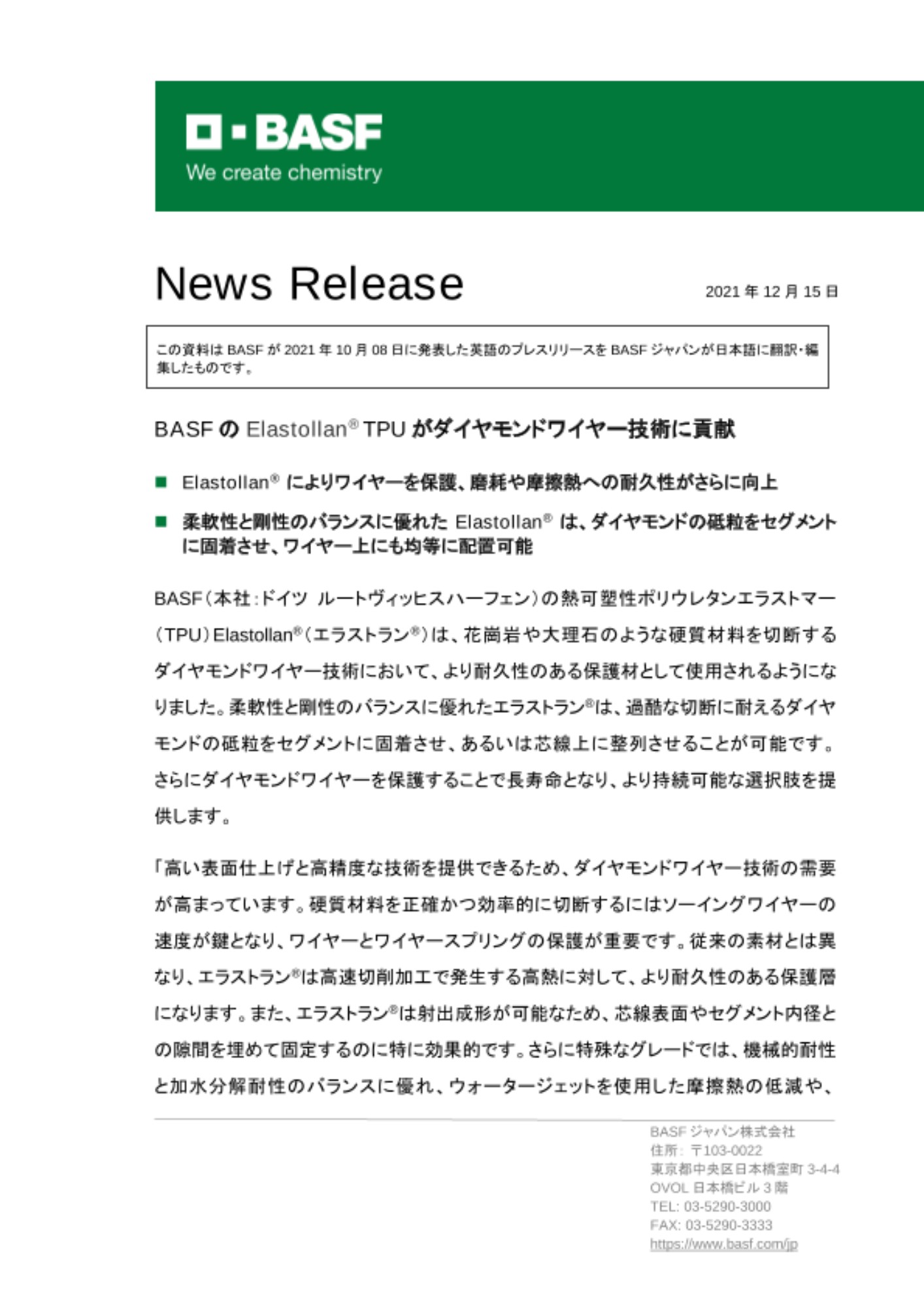 「世界のダイヤモンド工具産業は、ニッチながらも成長を続けている業界です。硬質材料を無駄なく、最大限の歩留まりで切断できる精密技術によって、建築や太陽電池、半導体などの分野で需要が拡大しています。エラストラン®による保護がダイヤモンドワイヤー技術を発展させ、再生可能エネルギーである太陽電池産業のようなダイナミックな産業の持続的な成長にも貢献できることを嬉しく思います」と、BASFパフォーマンスマテリアルズ事業本部 アジア地域統括本部 インダストリー部門、バイスプレジデントのマリリン・ライは述べています。