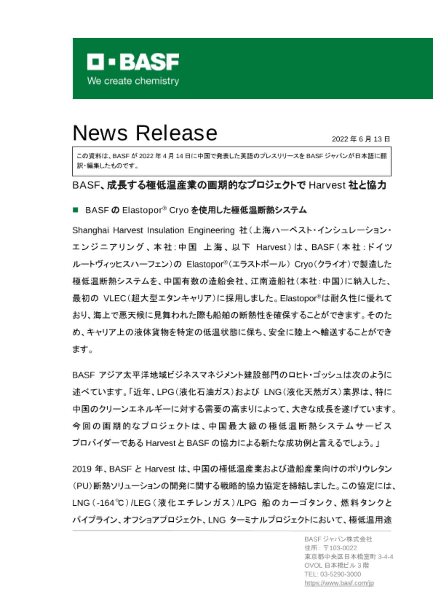 この資料は、BASFが2022年4月14日に中国で発表した英語のプレスリリースをBASFジャパンが日本語に翻訳・編集したものです。