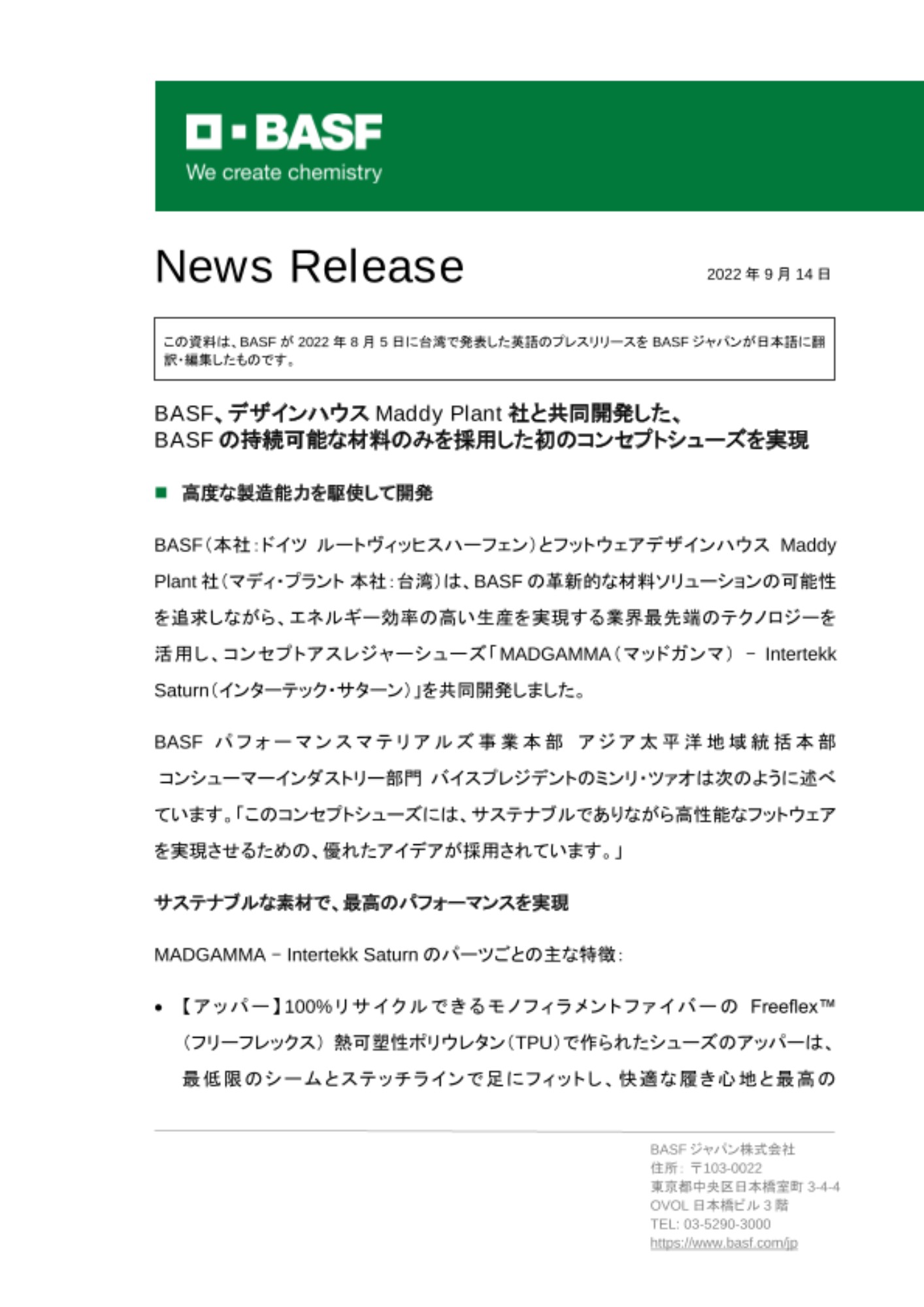 BASF(本社:ドイツ ルートヴィッヒスハーフェン)とフットウェアデザインハウスMaddy Plant社(マディ・プラント 本社:台湾)は、BASFの革新的な材料ソリューションの可能性を追求しながら、エネルギー効率の高い生産を実現する業界最先端のテクノロジーを活用し、コンセプトアスレジャーシューズ「MADGAMMA(マッドガンマ) - Intertekk Saturn(インターテック・サターン)」を共同開発しました。