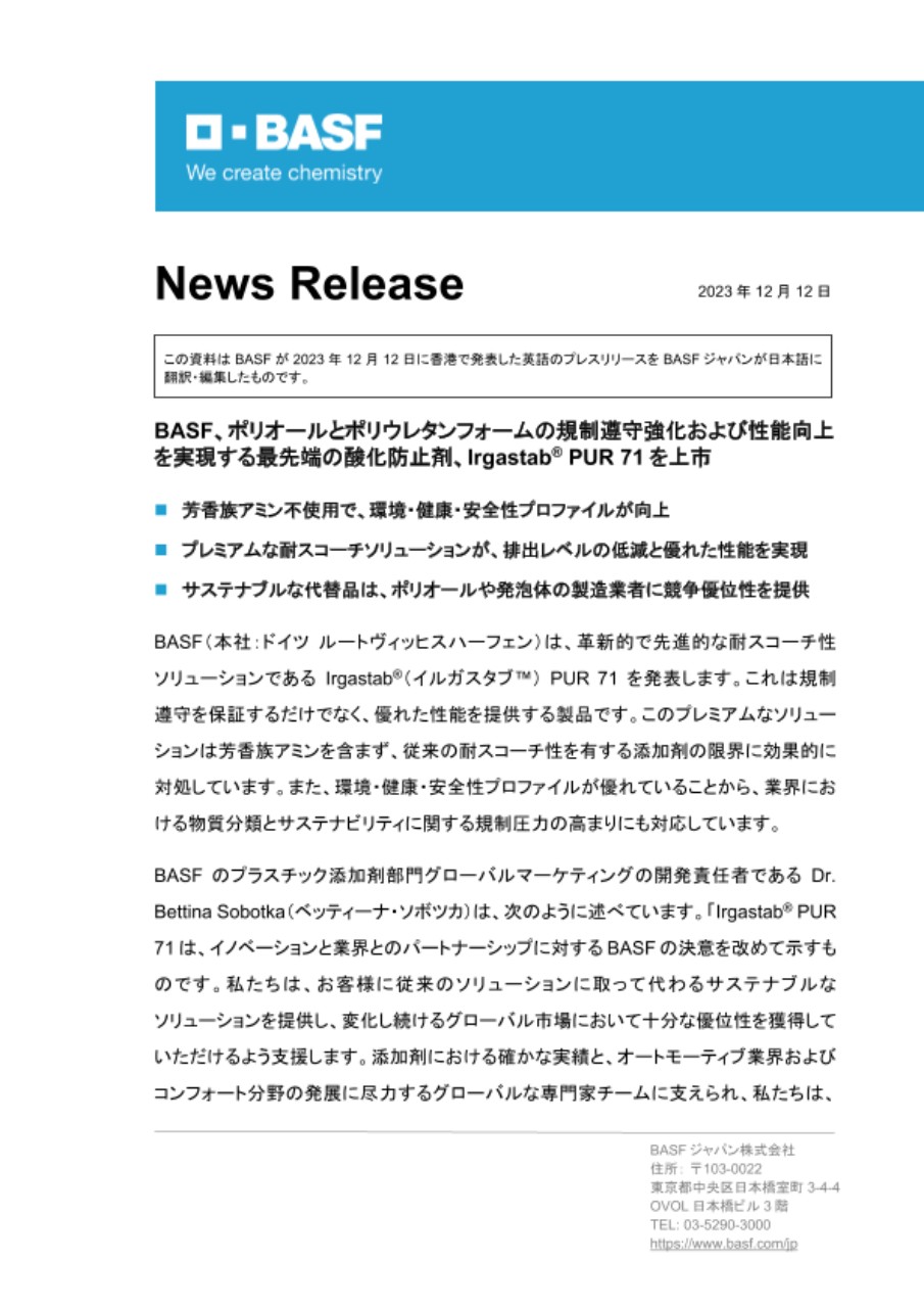 BASF、ポリオールとポリウレタンフォームの規制遵守強化および性能向上を実現する最先端の酸化防止剤、Irgastab® PUR 71を上市