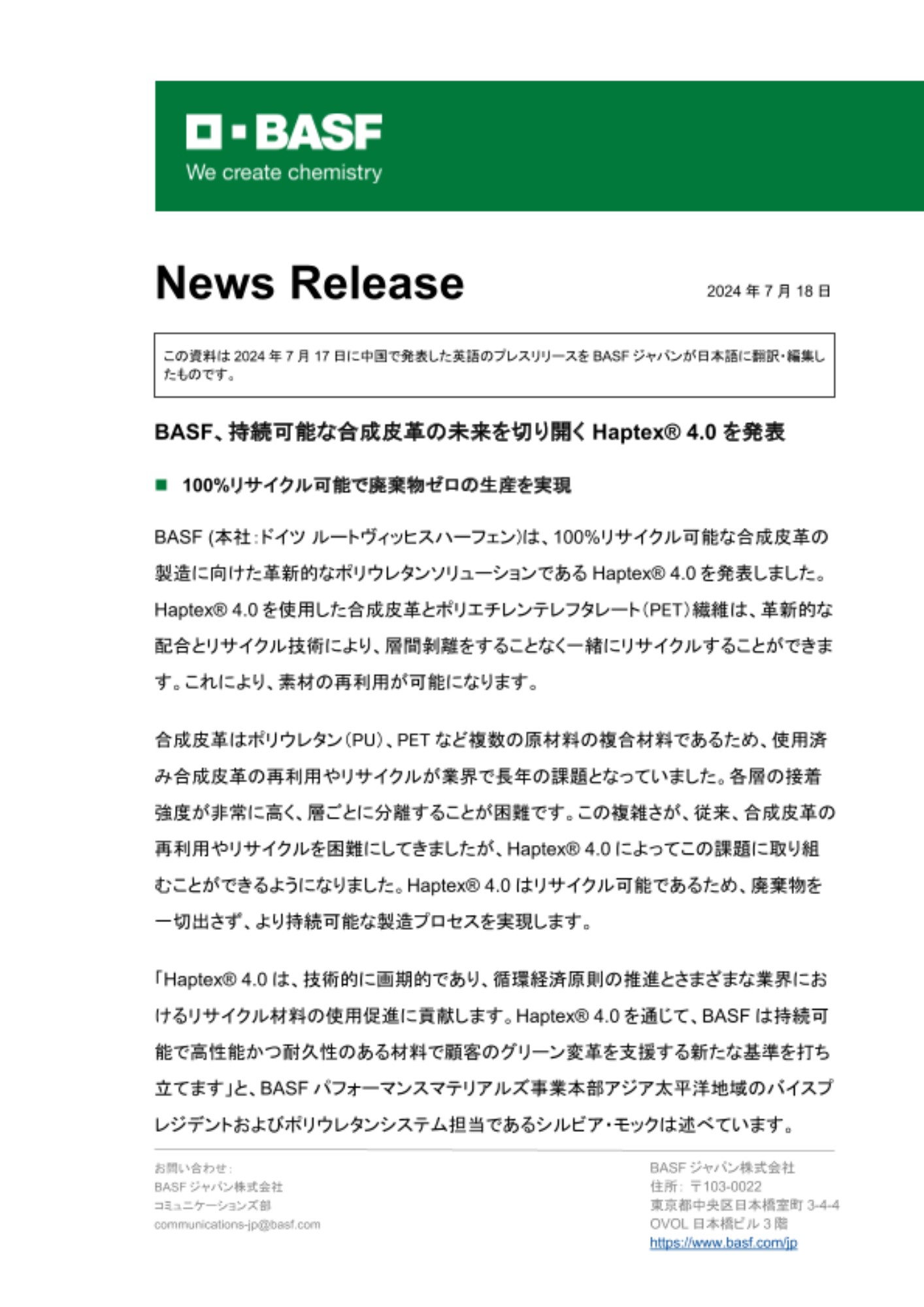 BASF、持続可能な合成皮革の未来を切り開く Haptex® 4.0 を発表