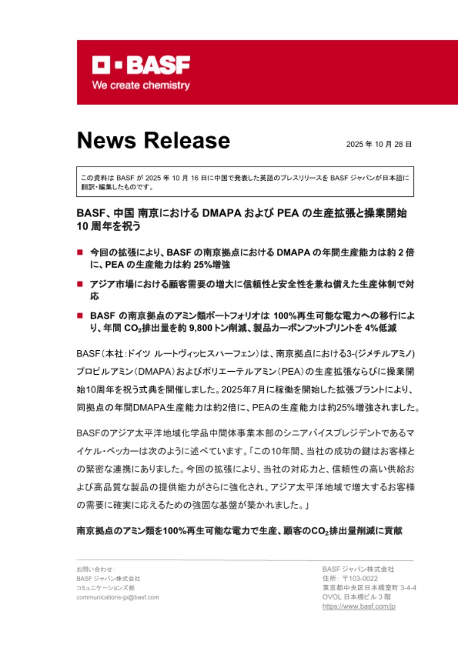 - 今回の拡張により、BASFの南京拠点におけるDMAPAの年間生産能力は約2倍に、PEAの生産能力は約25%増強