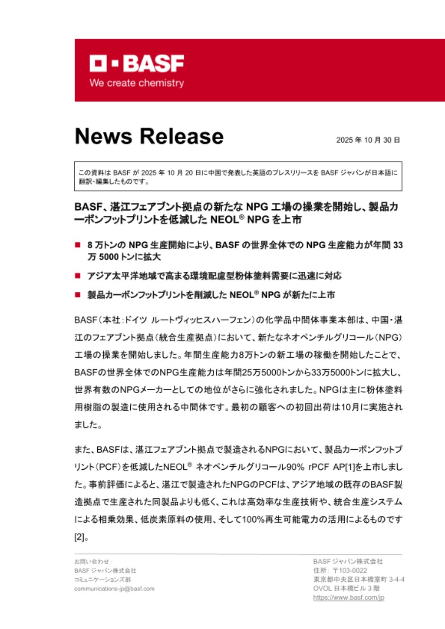 BASF、湛江フェアブント拠点の新たなNPG工場の操業を開始し、製品カーボンフットプリントを低減したNEOL® NPGを上市