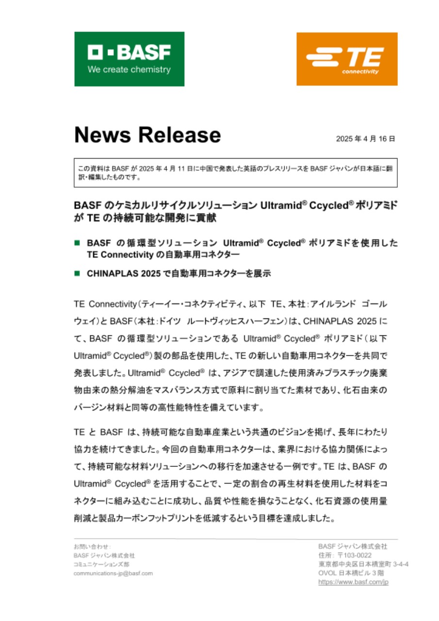 TE Connectivity(ティーイー・コネクティビティ、以下TE、本社:アイルランド ゴールウェイ)とBASF(本社:ドイツ ルートヴィッヒスハーフェン)は、CHINAPLAS 2025にて、BASFの循環型ソリューションであるUltramid® Ccycled® ポリアミド(以下Ultramid® Ccycled®)製の部品を使用した、TEの新しい自動車用コネクターを共同で発表しました。Ultramid® Ccycled® は、アジアで調達した使用済みプラスチック廃棄物由来の熱分解油をマスバランス方式で原料に割り当てた素材であり、化石由来のバージン材料と同等の高性能特性を備えています。