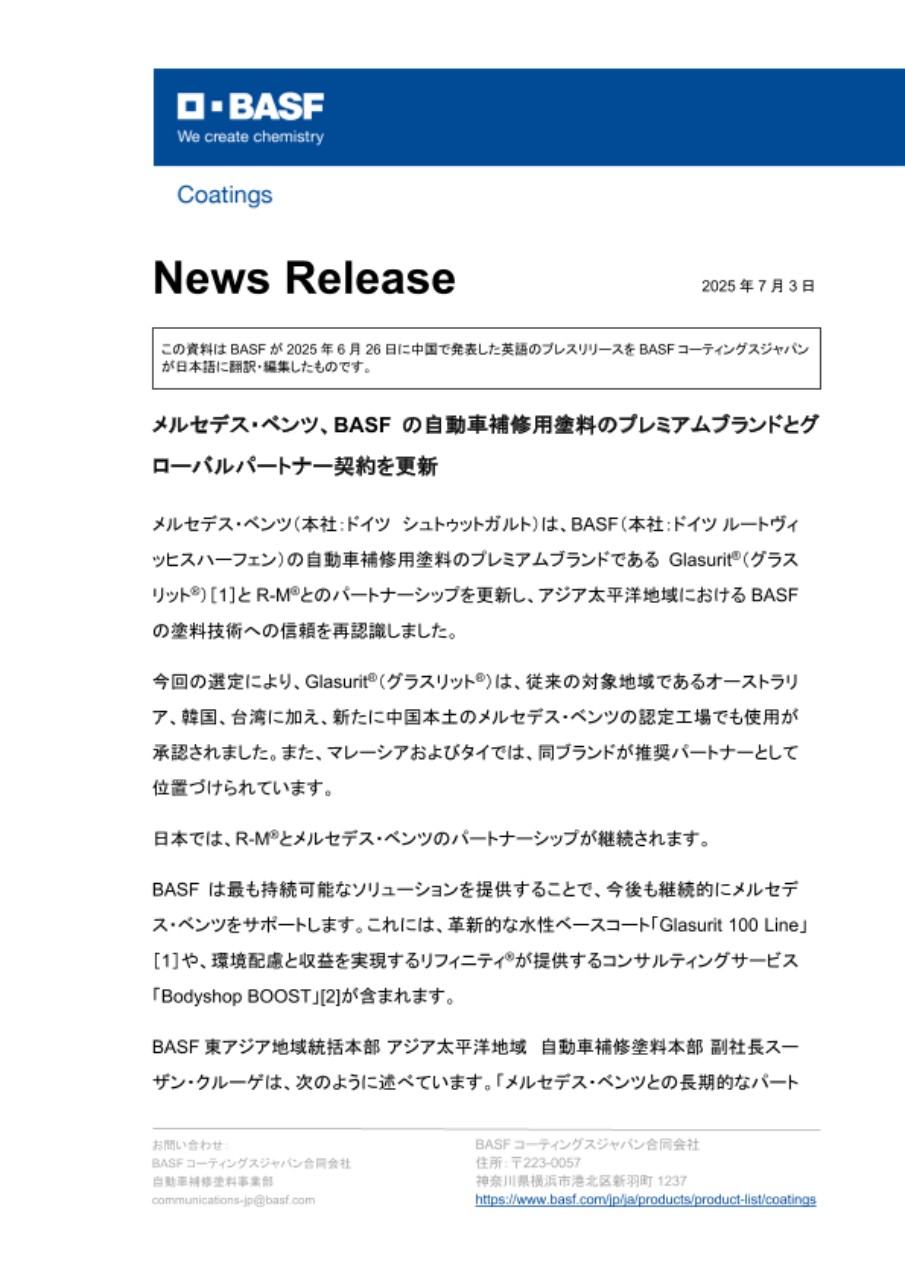 BASFコーティングスのグローバル戦略アカウントマネージャー、マイケル・ヒルは次のように述べています。「パートナーシップの更新は、革新性、持続可能性、卓越性という共通の価値観のもとに築かれた、メルセデス・ベンツとBASFのグローバル規模での協力関係と信頼関係を反映したものです。私たちはこれからもメルセデス・ベンツをサポートし、世界中の自動車補修ネットワークに最高水準の品質と効率を提供できることを誇りに思います。」