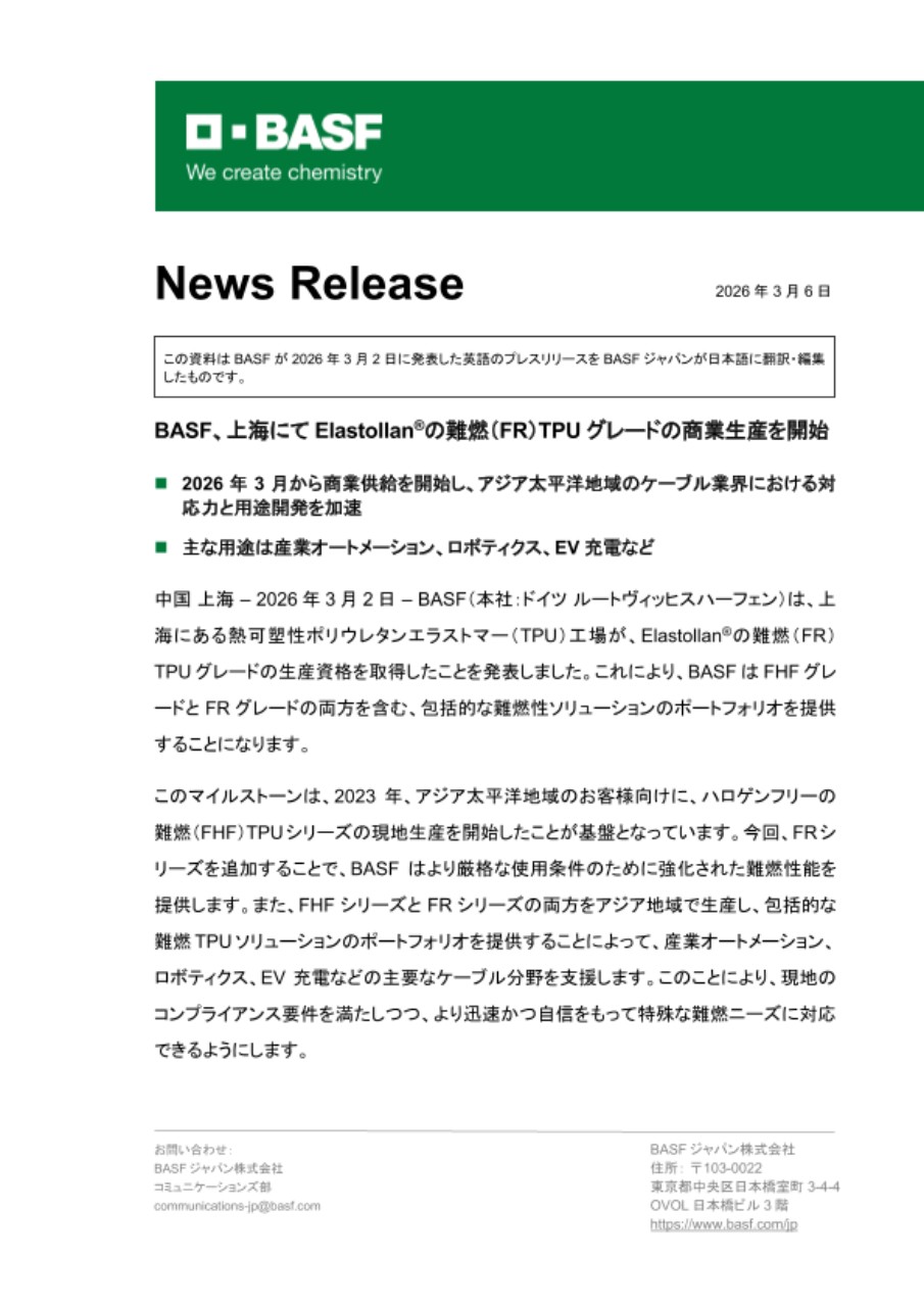 中国 上海 – 2026年3月2日 – BASF(本社:ドイツ ルートヴィッヒスハーフェン)は、上海にある熱可塑性ポリウレタンエラストマー(TPU)工場が、Elastollan®の難燃(FR)TPUグレードの生産資格を取得したことを発表しました。これにより、BASFはFHFグレードとFRグレードの両方を含む、包括的な難燃性ソリューションのポートフォリオを提供することになります。
