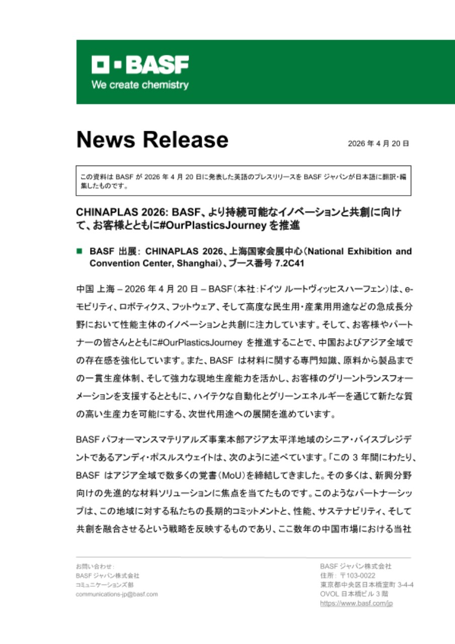この資料は BASF が 2026 年 4 月 20 日に発表した英語のプレスリリースを BASF ジャパンが日本語に翻訳・編集したものです。
