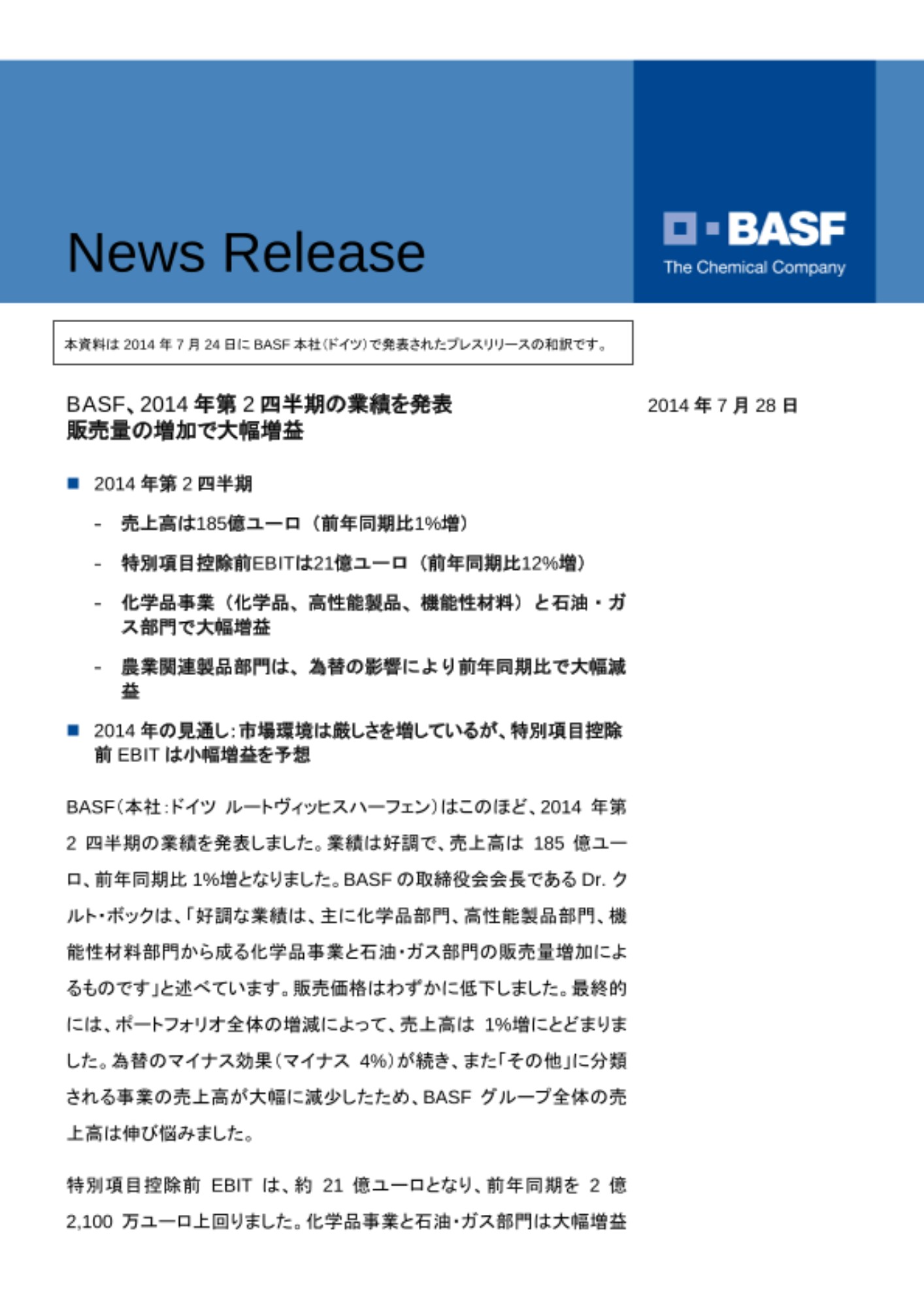 (本資料は 2014 年7月24日にBASF本社(ドイツ)で発表されたプレスリリースの和訳です。)