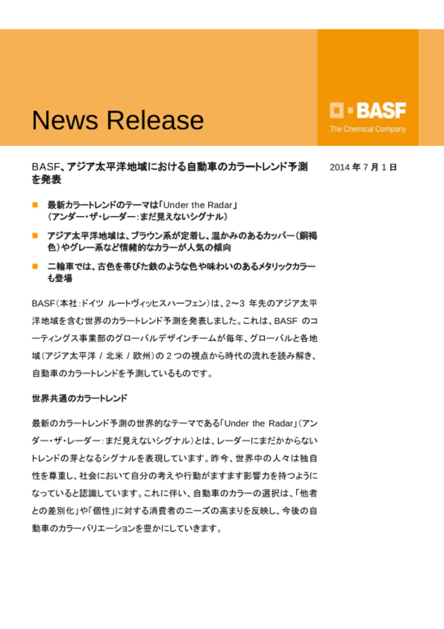 BASF (本社:ドイツ ルートヴィッヒスハーフェン)は、 2 ~ 3 年先のアジア太平洋地域を含む世界のカラートレンド予測を発表しました。これは、 BASF のコーティングス事業部の グローバルデザインチームが毎年、グローバルと各地域(アジア太平洋 / 北米 / 欧州)の 2 つの視点から時代の流れを読み解き、自動車のカラートレンドを予測しているものです。