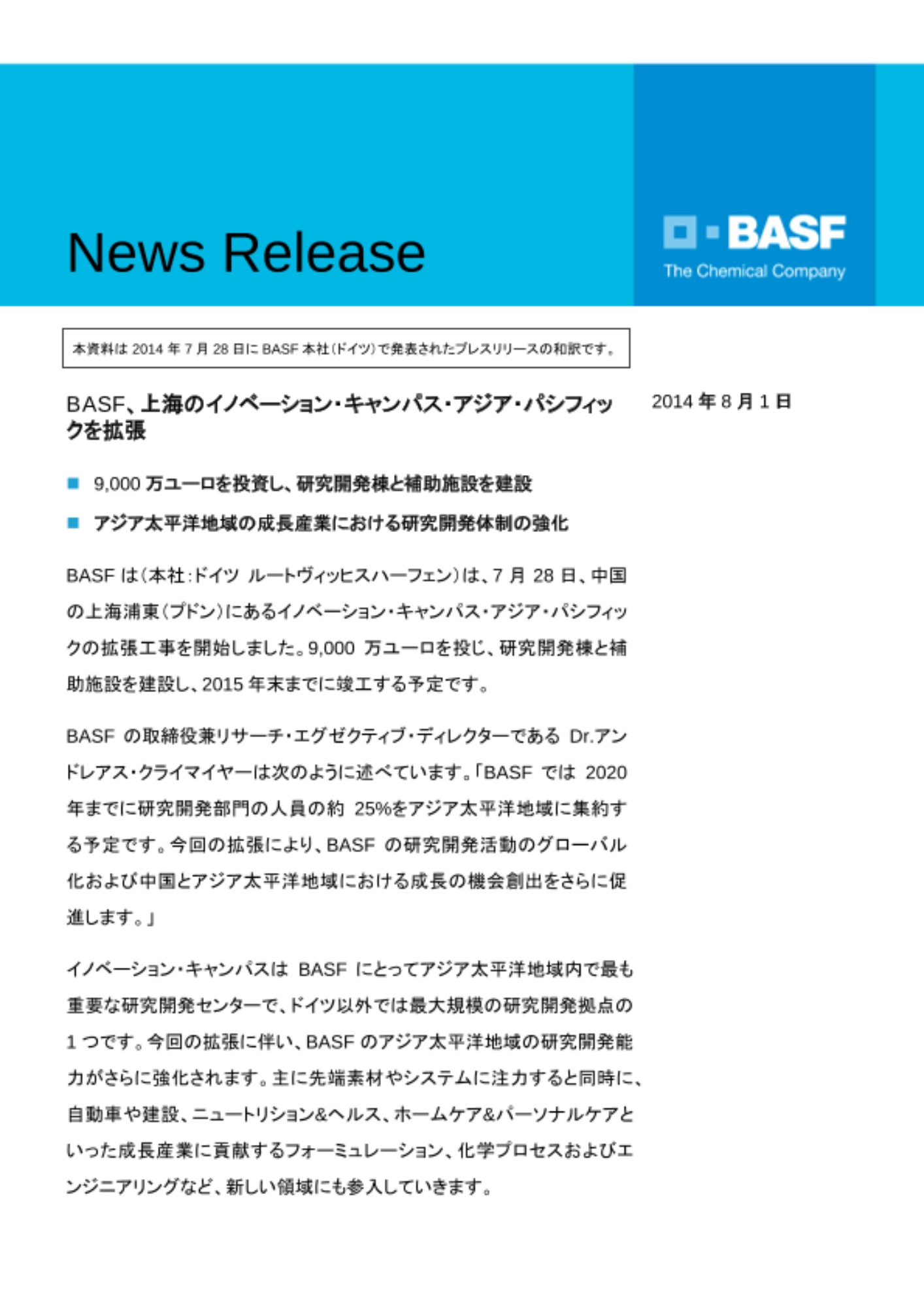 (本資料は 2014 年7月28日にBASF本社(ドイツ)で発表されたプレスリリースの和訳です。)