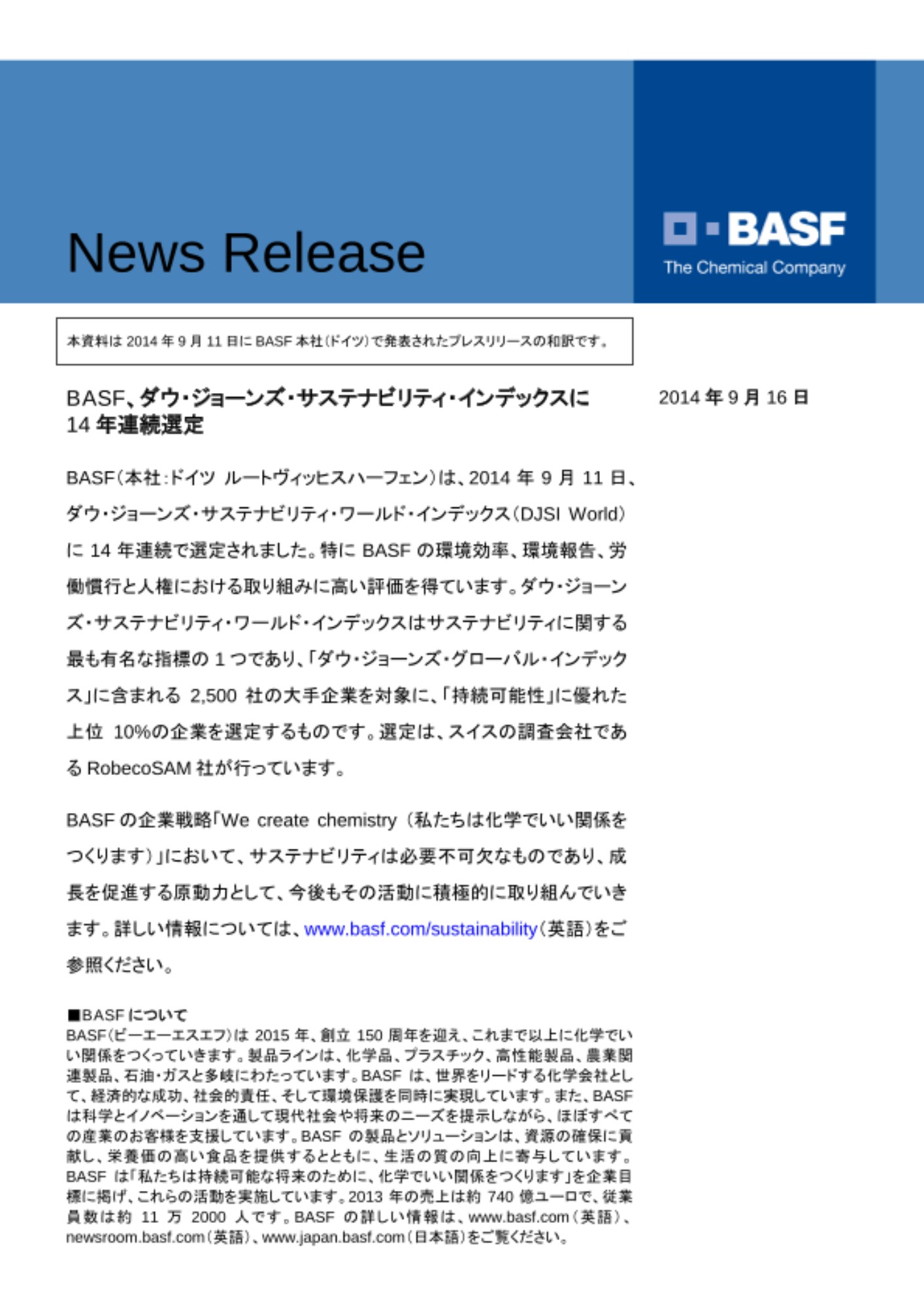 (本資料は 2014年9月11日にBASF本社(ドイツ)で発表されたプレスリリースの和訳です。)