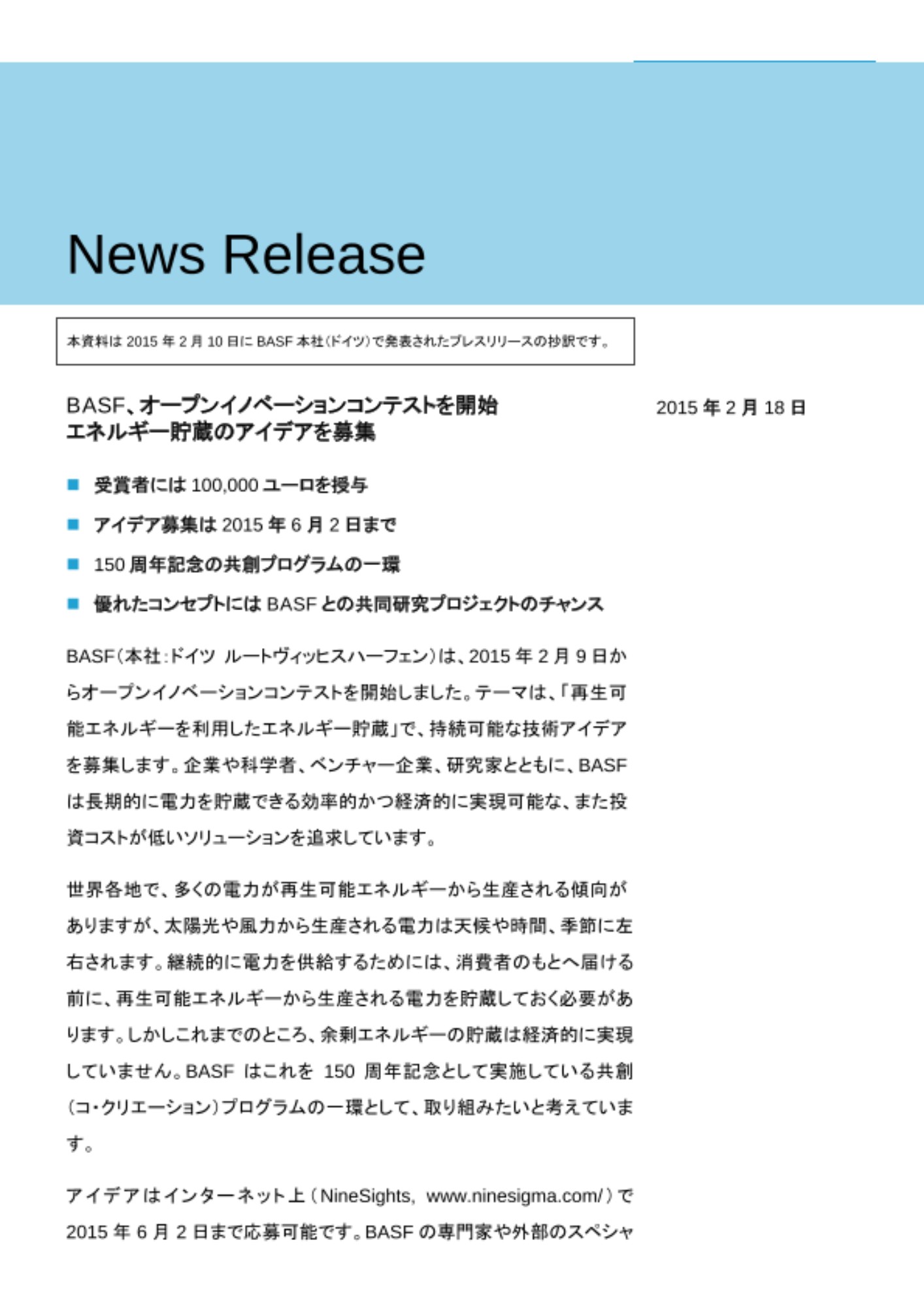 BASF (本社:ドイツ ルートヴィッヒスハーフェン)は、 2015 年 2 月 9 日からオープンイノベーションコンテストを開始しました。テーマは、「再生可能エネルギーを利用したエネルギー貯蔵」で、持続可能な技術アイデアを募集します。企業や科学者、ベンチャー企業、研究家とともに、 BASF は長期的に電力を貯蔵できる効率的かつ経済的に実現可能な、また投資コストが低いソリューションを追求しています。