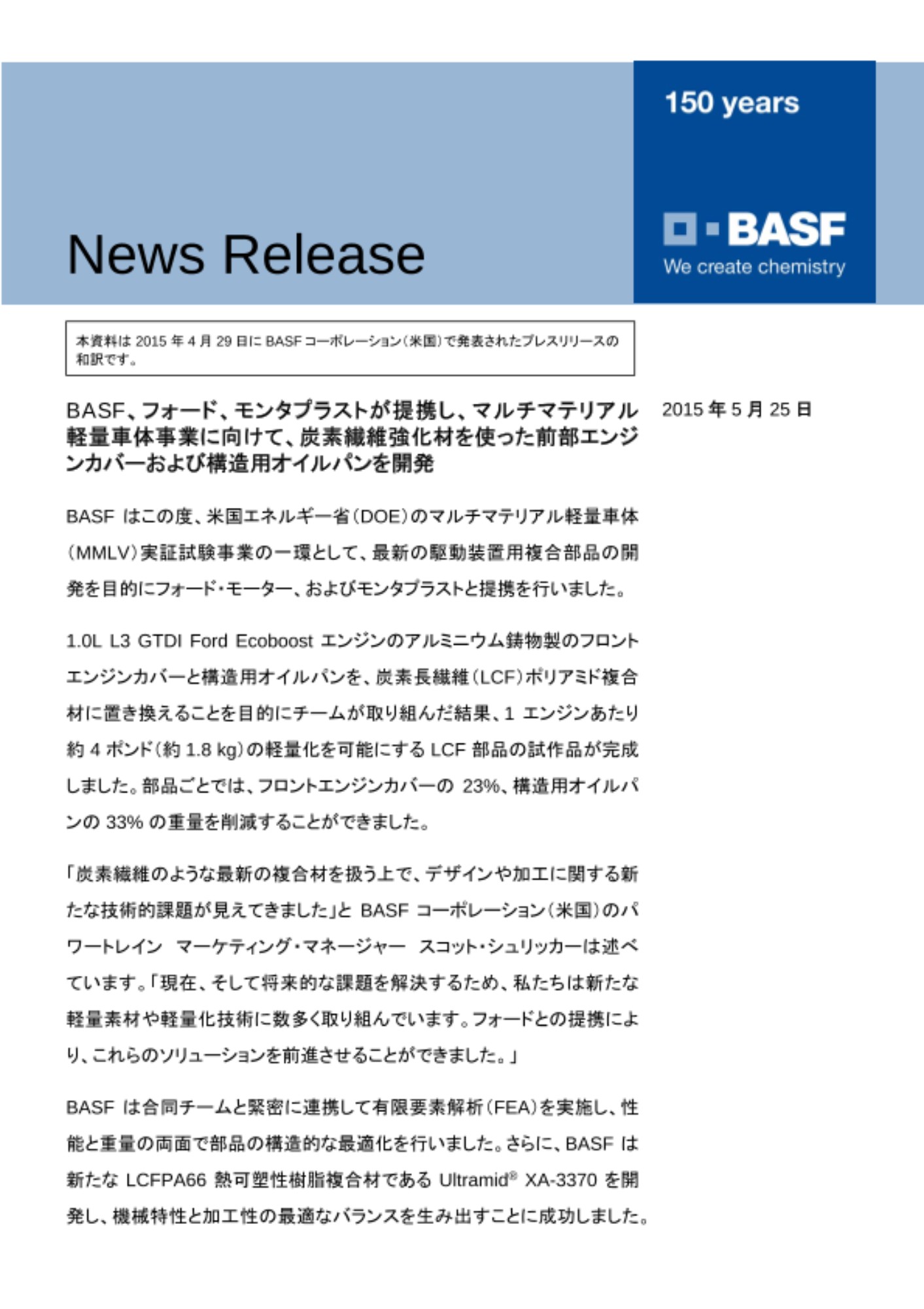 (本資料は 2015 年4月29日にBASFコーポレーション(米国)で発表されたプレスリリースの和訳です。)