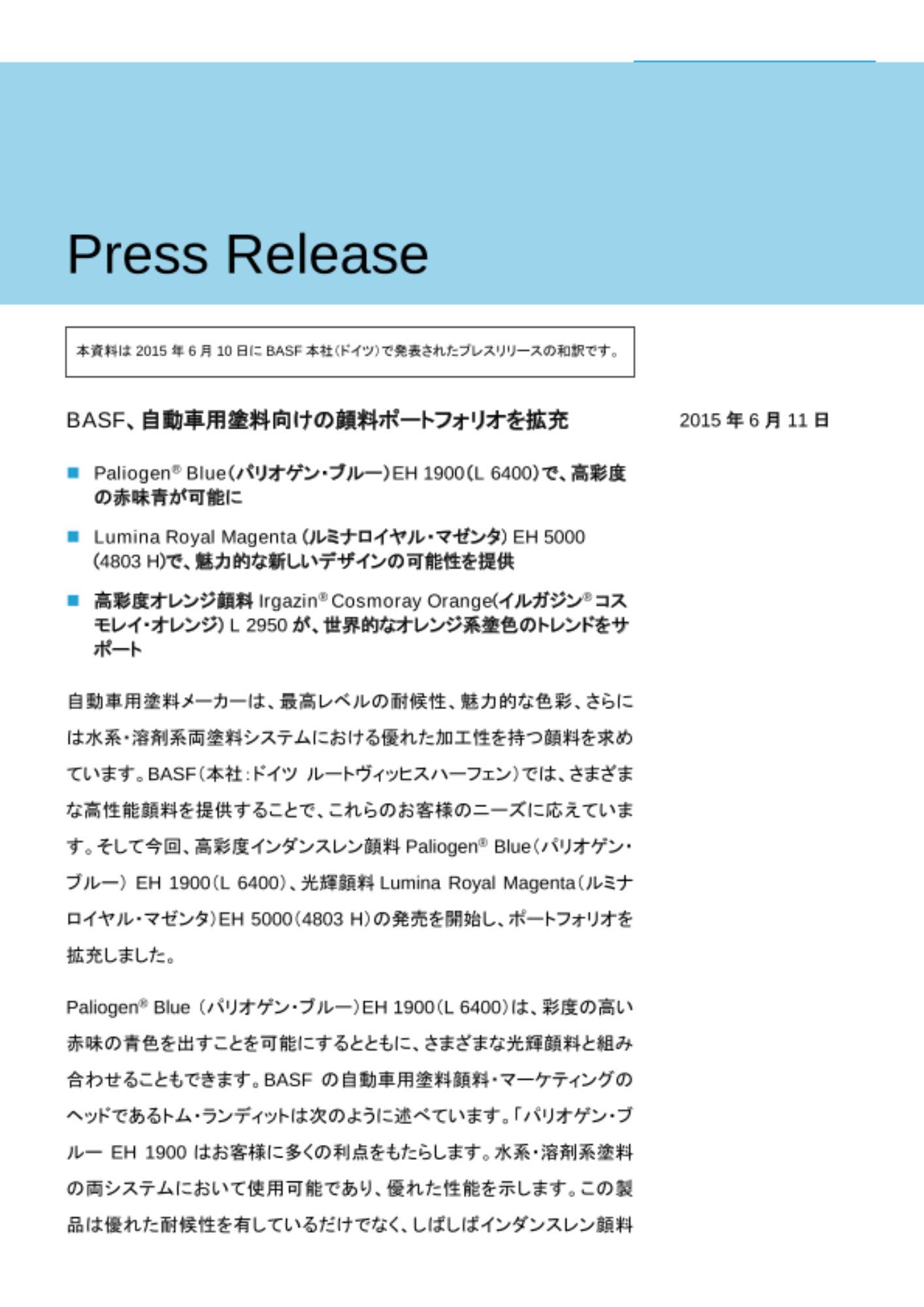 (本資料は 2015 年6月10日にBASF本社(ドイツ)で発表されたプレスリリースの和訳です。)