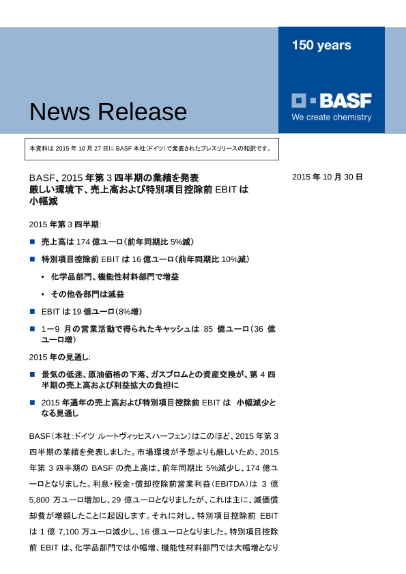 (本資料は 2015年10月27日にBASF本社(ドイツ)で発表されたプレスリリースの和訳です。)