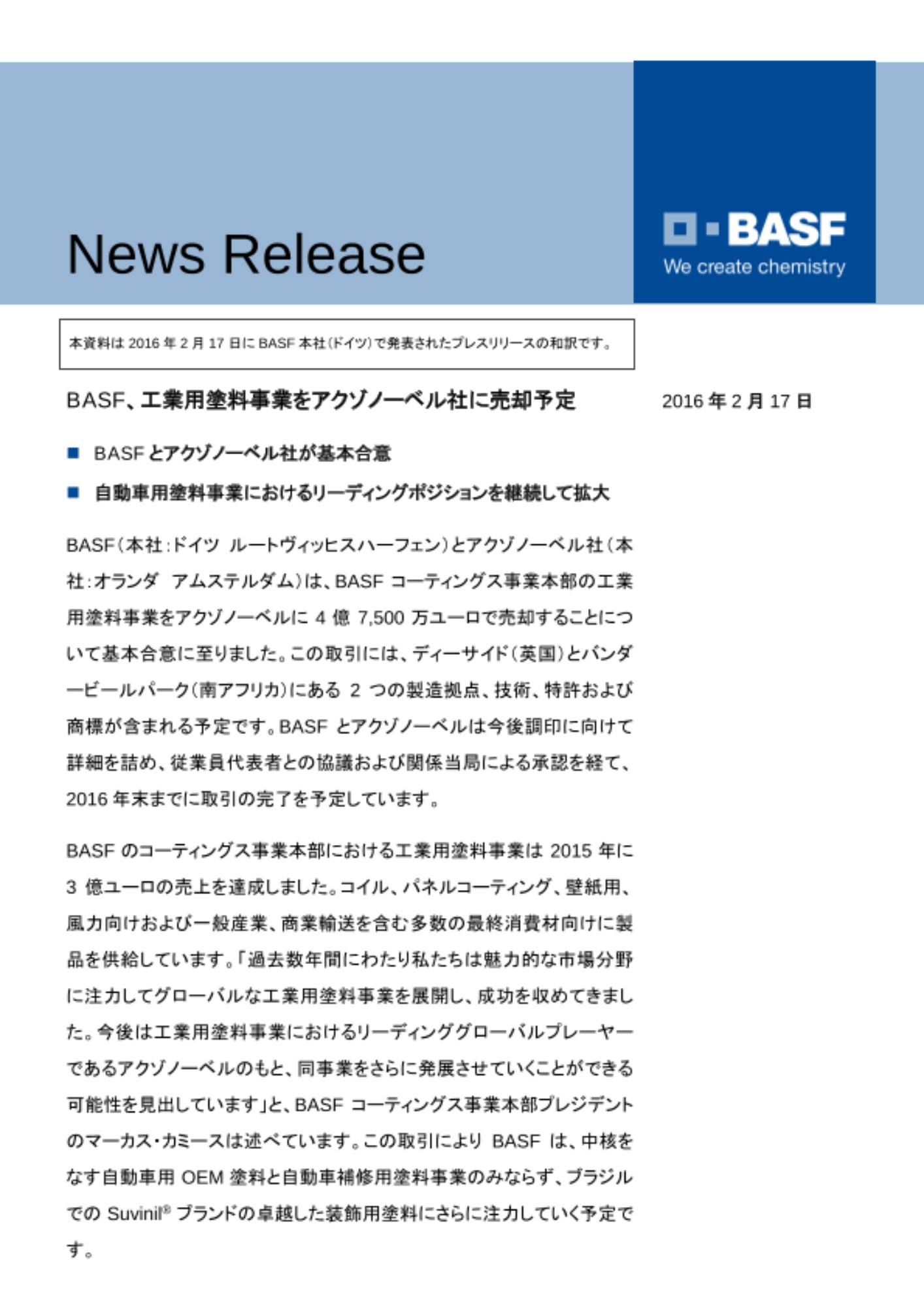BASF(本社:ドイツ ルートヴィッヒスハーフェン)とアクゾノーベル社(本社:オランダ アムステルダム)は、BASFコーティングス事業本部の工業用塗料事業をアクゾノーベルに4億7,500万ユーロで売却することについて基本合意に至りました。この取引には、ディーサイド(英国)とバンダービールパーク(南アフリカ)にある2つの製造拠点、技術、特許および商標が含まれる予定です。BASFとアクゾノーベルは今後調印に向けて詳細を詰め、従業員代表者との協議および関係当局による承認を経て、2016年末までに取引の完了を予定しています。