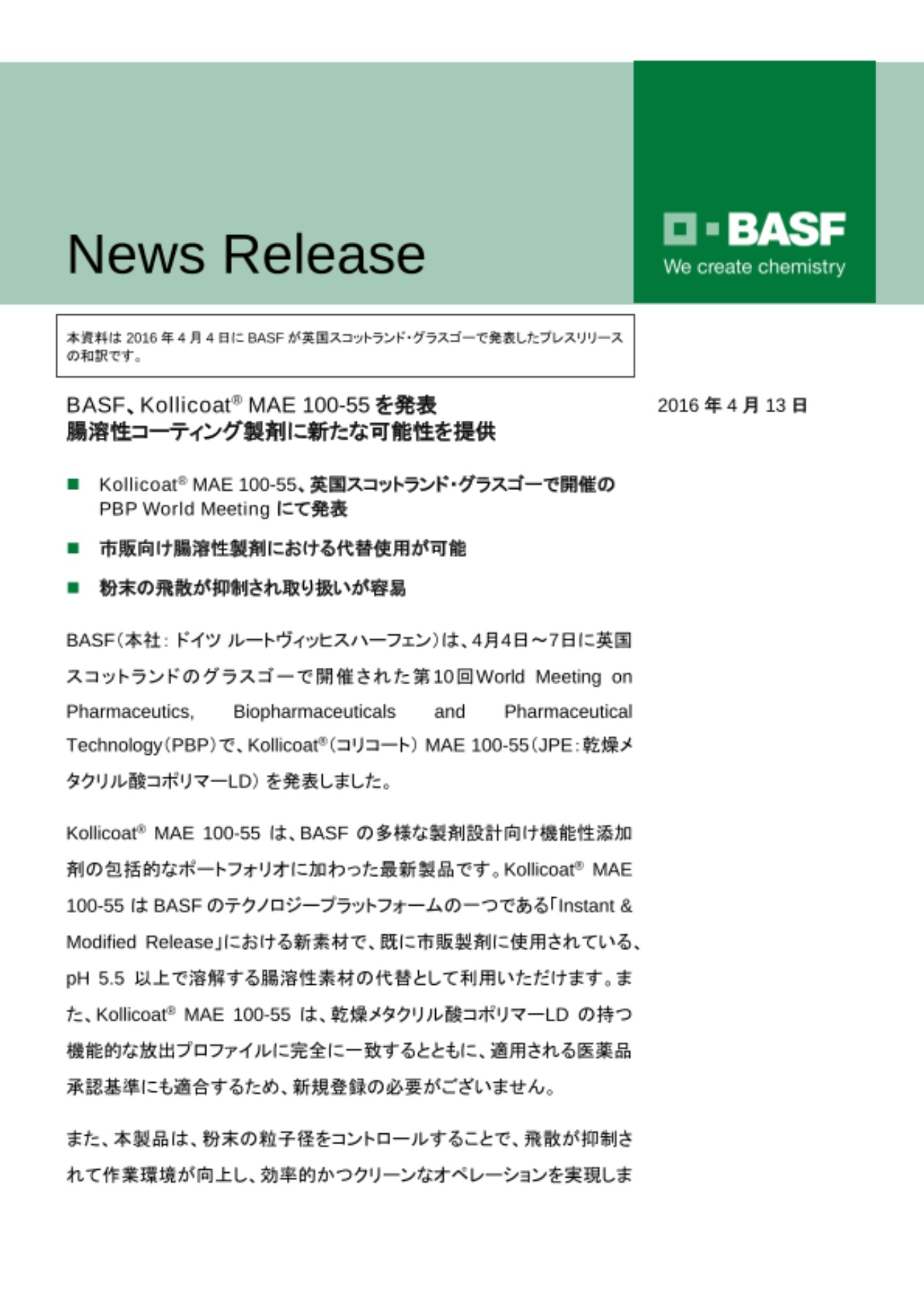 BASFのファーマソリューションズのグローバルマーケティング責任者であるKai Sievertは次のように述べています。「BASFはKollicoat® MAE 100-55 によって、メタクリル酸-アクリル酸エチル共重合体をベースとしたpH 5.5以上で溶解する腸溶性素材の提供を拡充し、製薬会社に多様な製剤設計の可能性と供給安定性を提供します。」